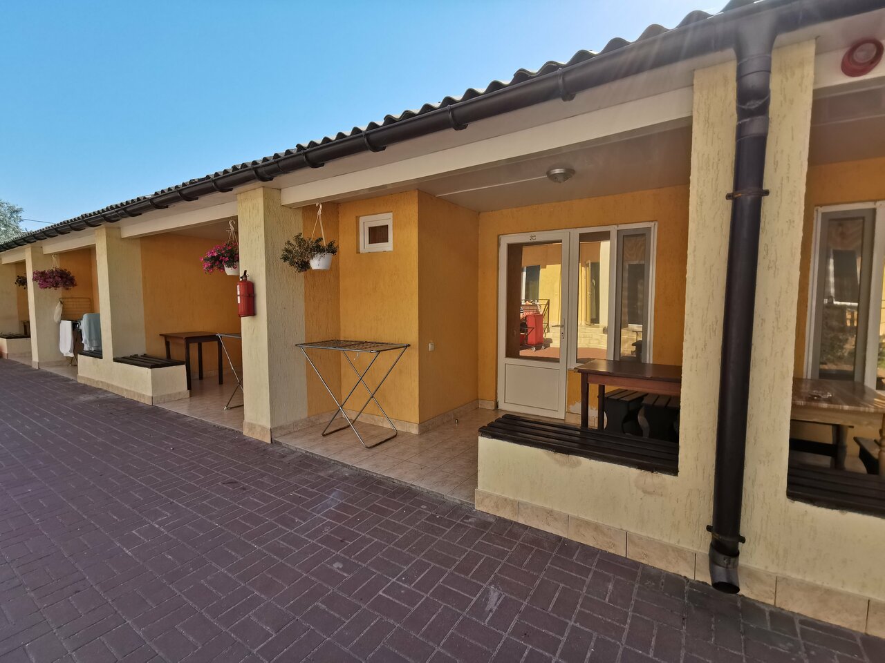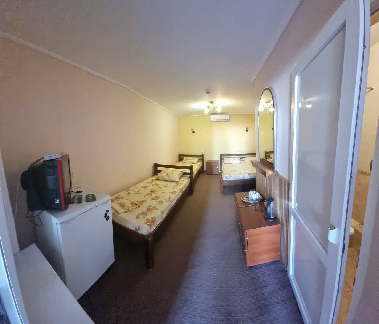Пансионат на берегу моря. Есть один двухэтажный корпус, в котором часть номеров имеют вид на море. Остальные живут в одноэтажном бараке, разделенном на отдельные комнатки с видом на двухэтажный корпус. Есть еще отдельно стоящее строение на один номер около парковки. Парковка большая достаточно. В обычном номере есть санузел с душем, шкаф, телевизор, чайник, маленькая верандочка со столиком и двумя табуреточками. Всё по простому, но нормально вполне. Можно заказать питание в кафе. Есть собственный пляж с зонтиками и лежаками, но на всех их не хватает. Пляж прямо рядом, вышел — и море.
