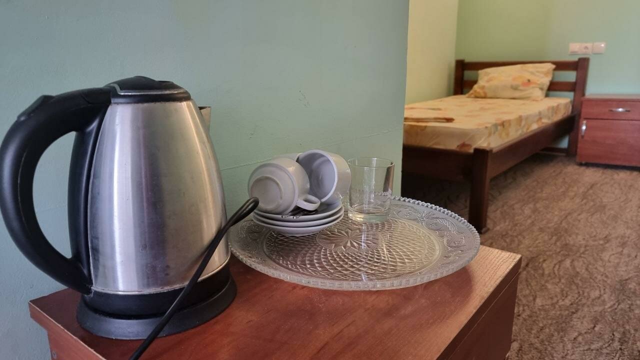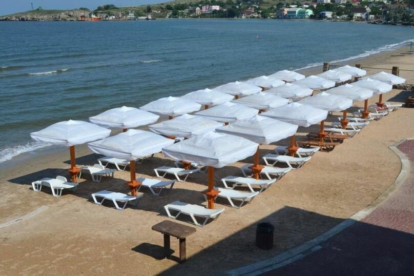 Здравствуйте. Мы были в отеле июне 2022г. Таких отелей с зонтиками, шезлонгами, с детской площадкой в Щелкино немного. Каждый день выдают полотенца для шезлонга. На территории есть столовая. Готовят по домашнему вкусно. Задумка отеля хорошая. Номерному фонду нужен современный косметический ремонт.