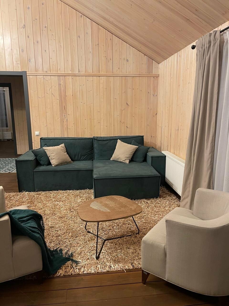 Очень стильное и классное место для отдыха! С одной стороны уединение с природой, с другой стороны цивилизация) Дом новый, чистый и все продумано до мелочей. Территория большая придомовая . До озера минут 15, до пятерочки и Сбербанка 5 мин))