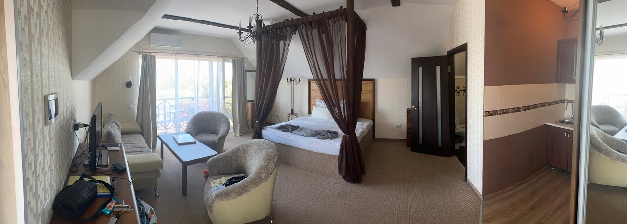 Хорошая ухоженная территория. Номер у нас был небольшой, но уютный и комфортный для проживания. Из минусов — кухня. Вернее персонал на кухне. Официанты откровенно грубят. Заказать еду по меню вы не можете. Только заранее. На ужине — заказываете завтрак. На завтраке — обед. Это не удобно.