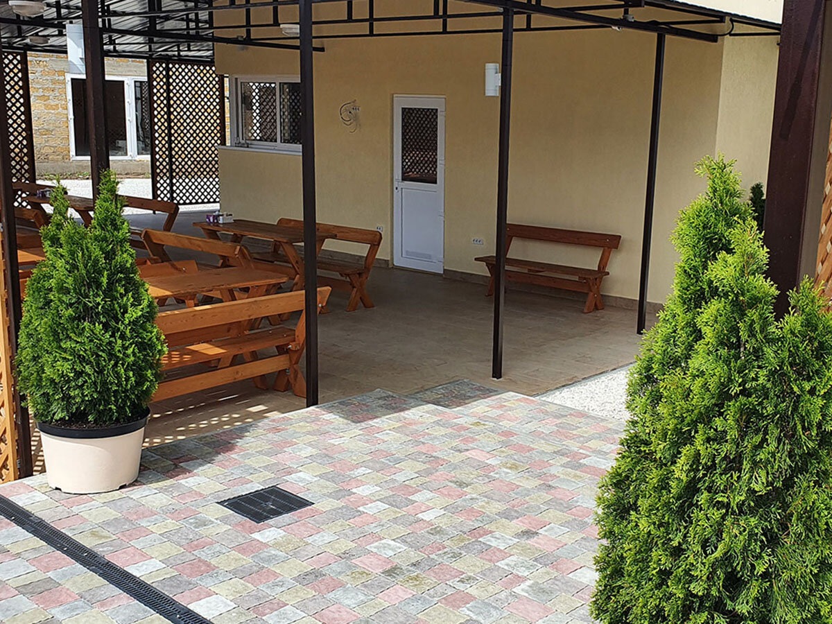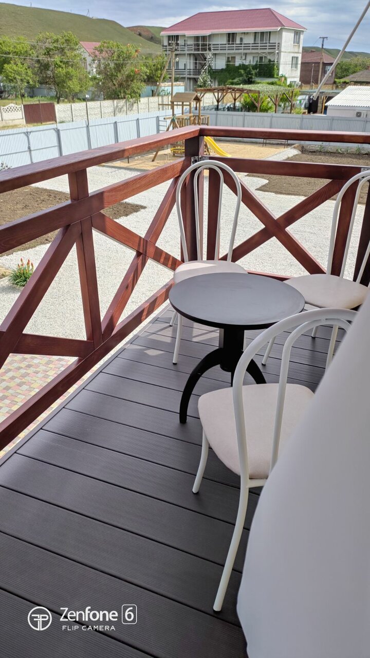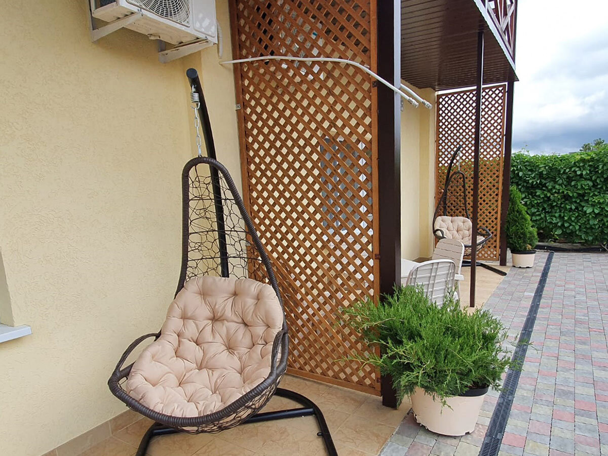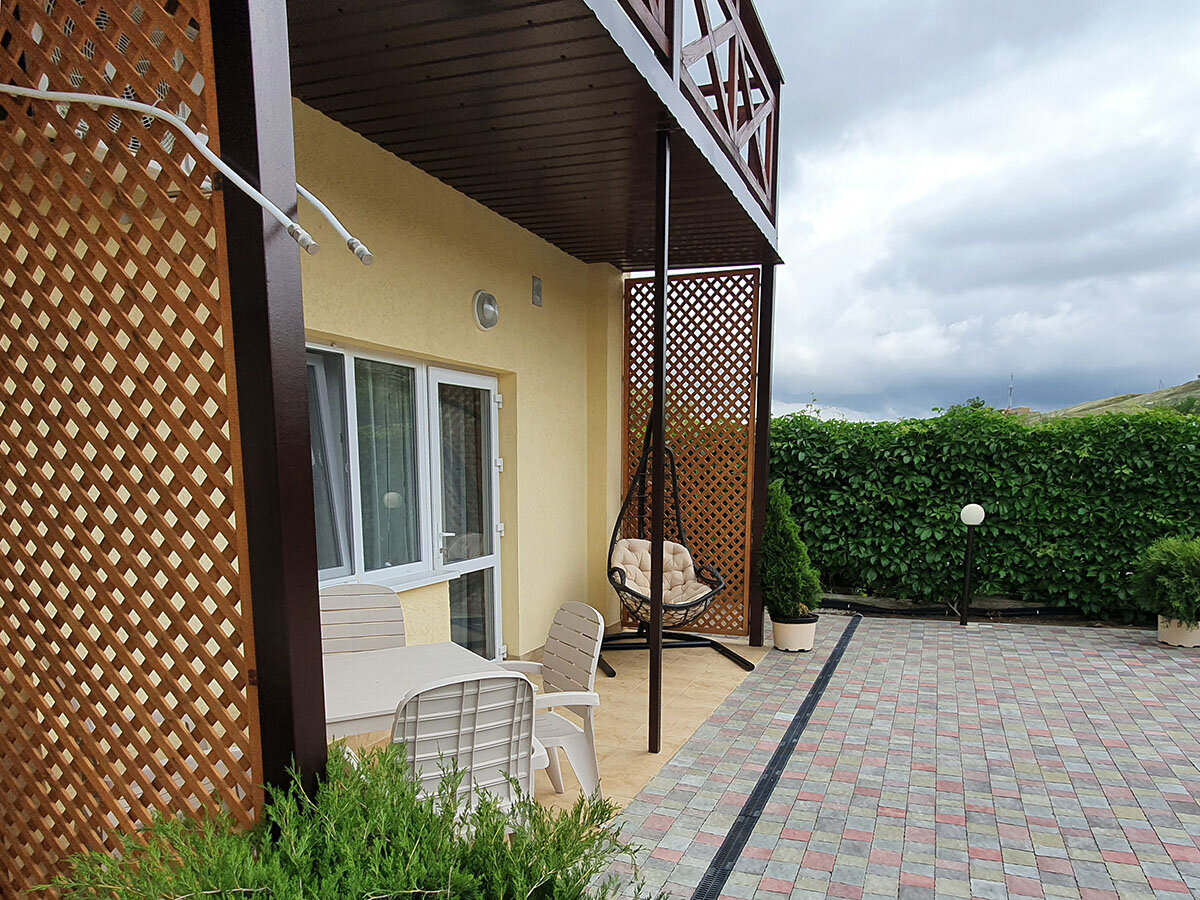 Хорошее, тихое место! Уютный номер, просторный балкон с мебелью и сушилкой для белья. Все новое. На территории есть общая кухня с посудой, две плиты, микроволновка и чайник. Столики в обеденной зоне. Мангал. Детская площадка. Так же можно было заказать завтраки, обеды и ужины — готовят сами хозяева — очень вкусно, по-домашнему. Мне не хватило чайника в номере, лень иногда было ходить на кухню)