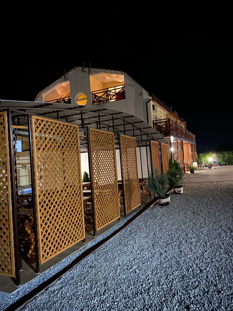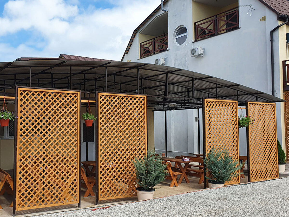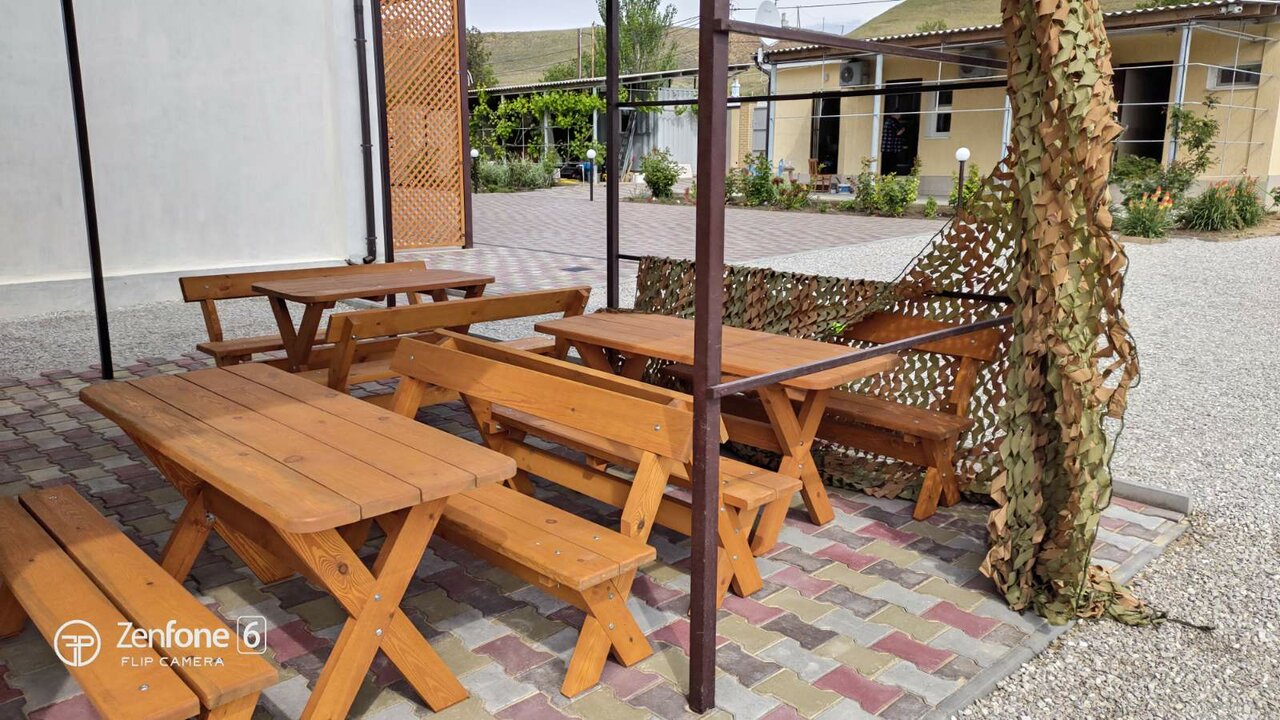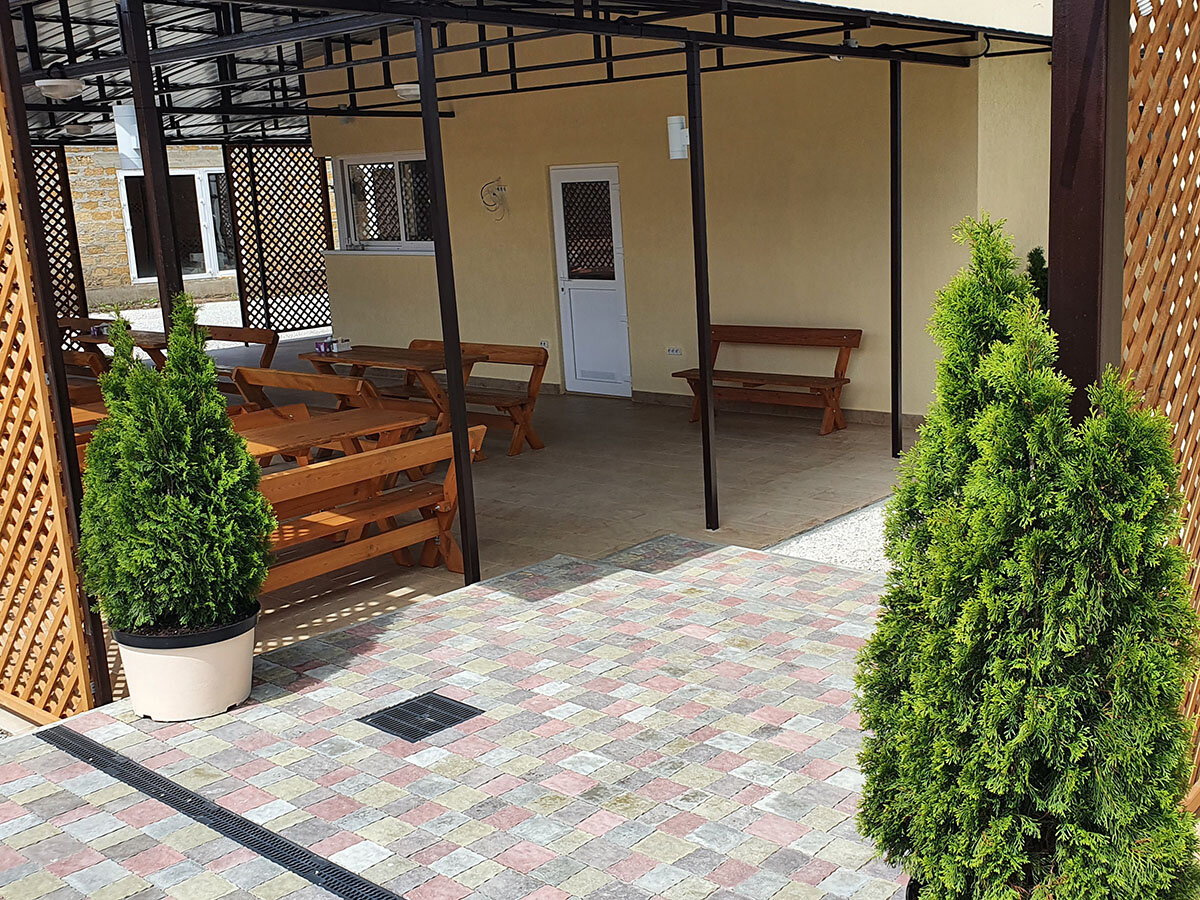Хорошее, тихое место! Уютный номер, просторный балкон с мебелью и сушилкой для белья. Все новое. На территории есть общая кухня с посудой, две плиты, микроволновка и чайник. Столики в обеденной зоне. Мангал. Детская площадка. Так же можно было заказать завтраки, обеды и ужины — готовят сами хозяева — очень вкусно, по-домашнему. Мне не хватило чайника в номере, лень иногда было ходить на кухню)