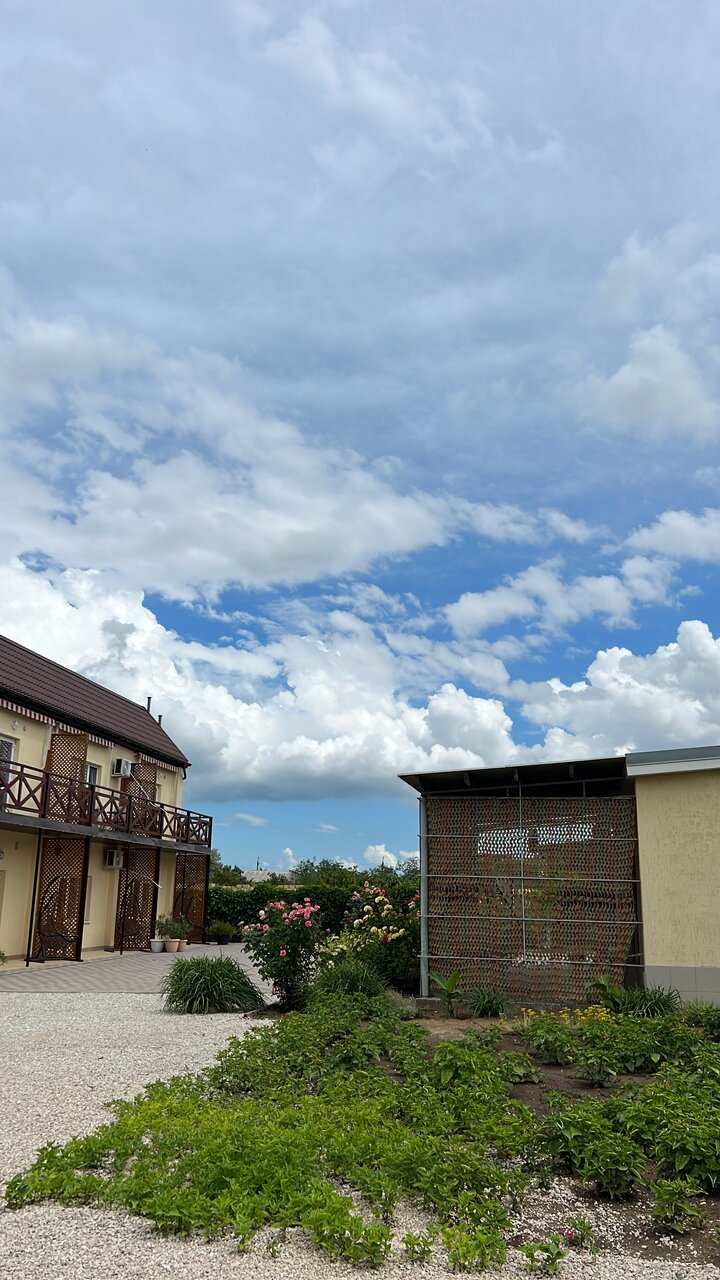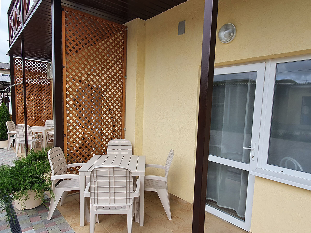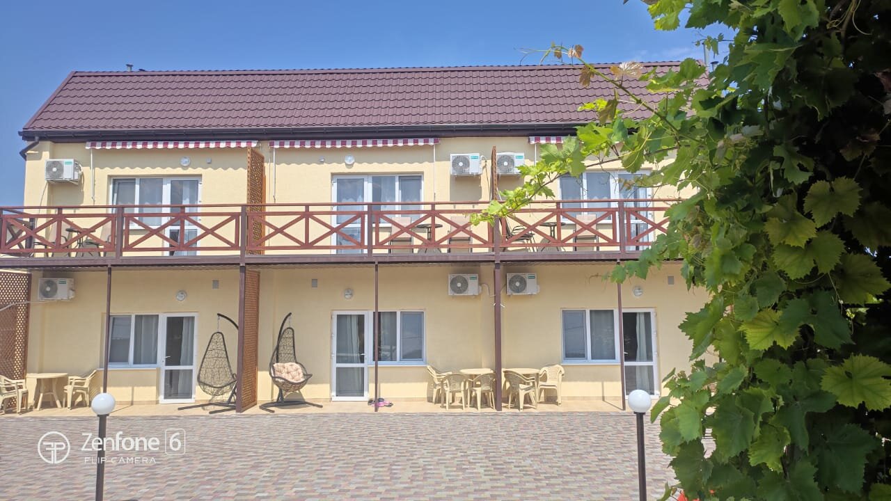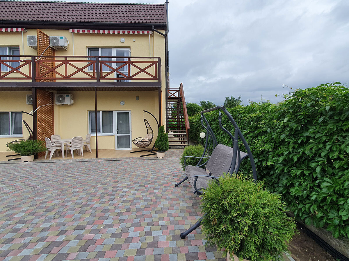 Отличный гостевой дом! Отдыхали в сентябре 2021 года. Хозяйка Ольга с командой сделала все возможное, чтобы гостям было удобно и комфортно. Мебель, белье, сантехника новое, чистое. Вообще дизайн приятный, европейского уровня. В номере телевизор, холодильник, чайник, фен ( мы жили в мансарде). На территории есть типа столовой на открытой террасе, повар Катюша прекрасно готовит. Есть кухня, можно приготовить самим. Белье, полотенца меняют очень часто ( спасибо Люде). До моря 5-7 мин ходьбы. Море чистое (несколько дней было испорчено медузми, но это проблема всего Азовского моря), народу очень мало ( правда мы были в первой половине сентября) . Немаловажный плюс гостевого дома- можно с собаками! Из пожеланий: мне кажется, что если приезжать в высокий сезон, то на самостоятельной кухне будет очередь, все-таки она маловата.