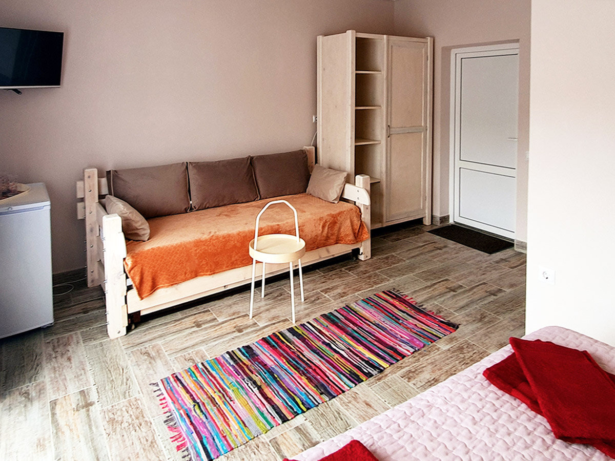 «Премиум» идеально подходит для семьи с детьми, 25м2. В номере есть: Wi-Fi, ТВ, холодильник, кондиционер, санузел c душем, шкаф. Двуспальная кровать + кровать с доп. выдвижным матрасом. Перед входом у каждой комнаты есть своя летняя площадка.