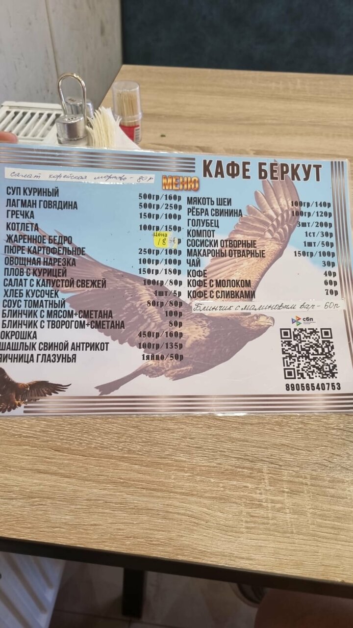 Подсунул сухой старый шашлык под видом только что испеченного. Говорит только что пожарил. Как увидел что я его ножом не могу порезать,другим посетителям предлагать не стал, говорит закончился , хотя мне предлагал взять 450 грамм , из которых я взял 170)). В остальном все вкусно, брали супы и второе, цена адекватная.