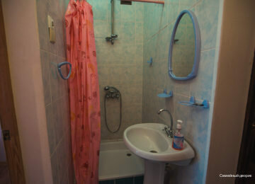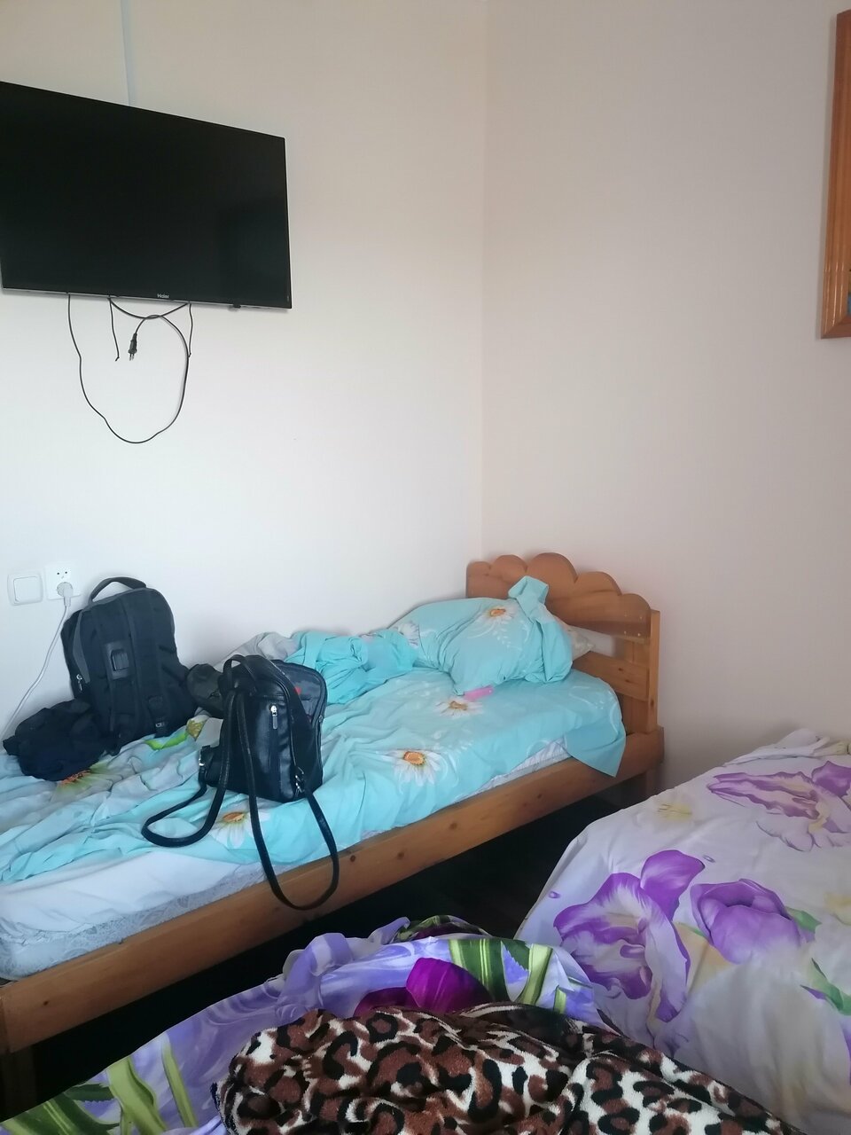Комната на четверых, ( 1 двуспальная кровать и 2 односпальных) удобства на этаже. Есть кондиционер, ТВ. Полотенца. Комната чистая, светлая, матрасы не продавленные. Туалет и душ нормальные, но очень маленькие. Приехали поздно, хозяйка предложила ужин. Борщ и компот, очень вкусные. Домашние. При желании можно заказать и завтрак.