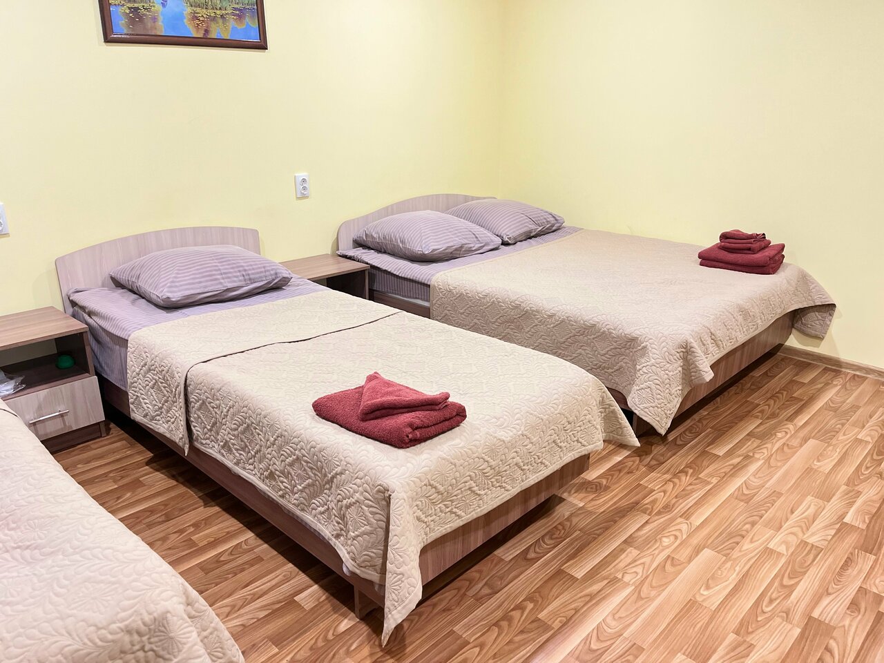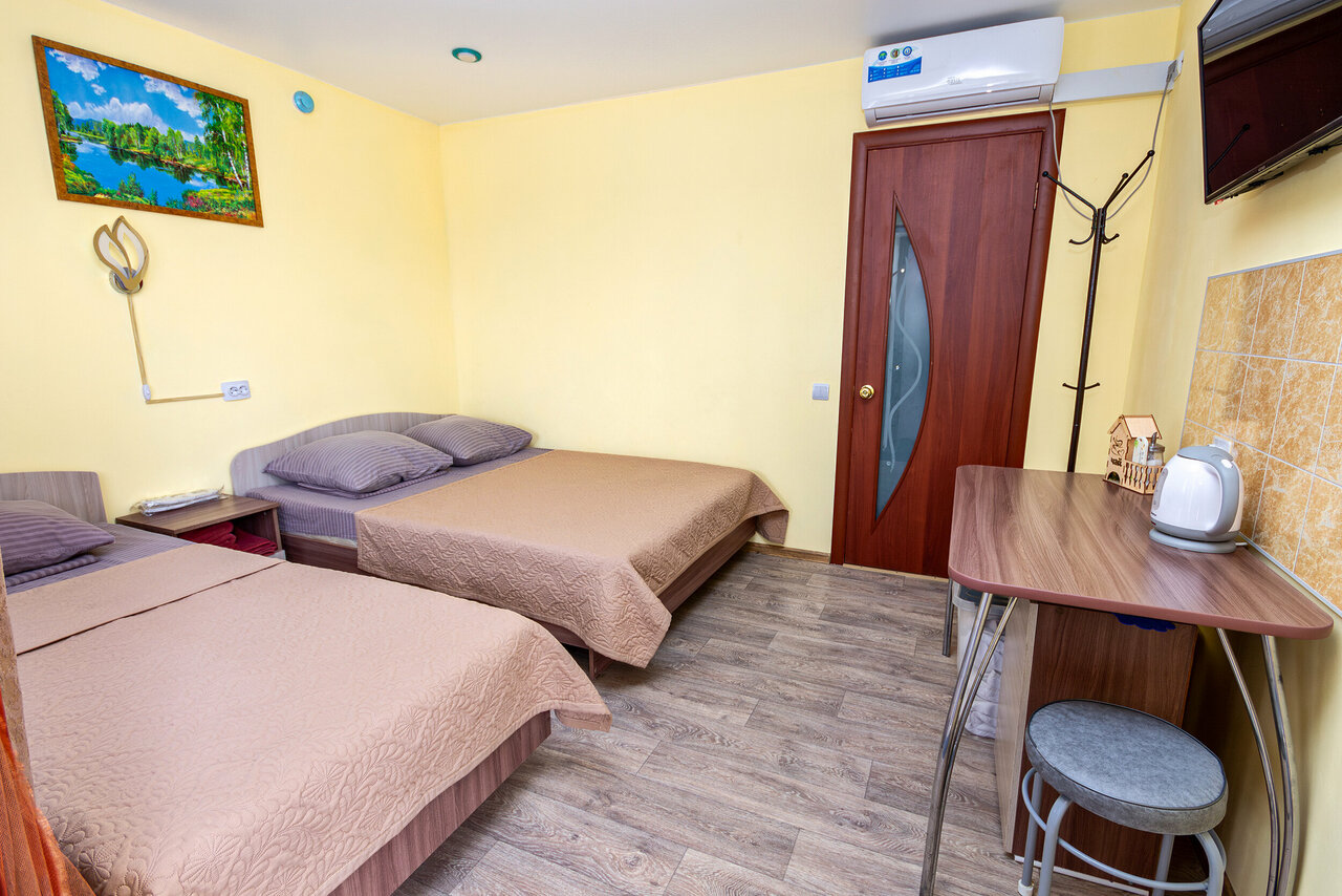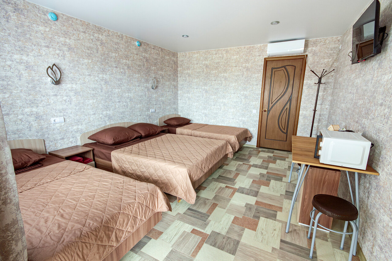Четырёхместный номер в гостевом доме со всеми удобствами и бесплатной парковкой. Стоимость от 2000 руб., одна двуспальная кровать и две полуторные кровати, кондиционер, телевизор, душ, микроволновка, чайник, полотенца и средства гигиены.