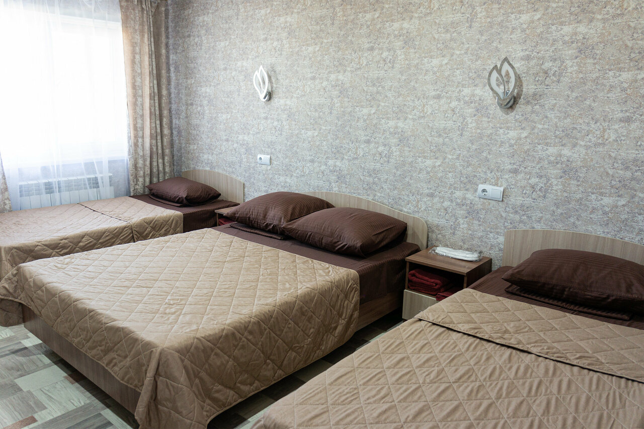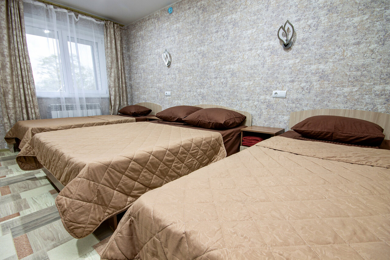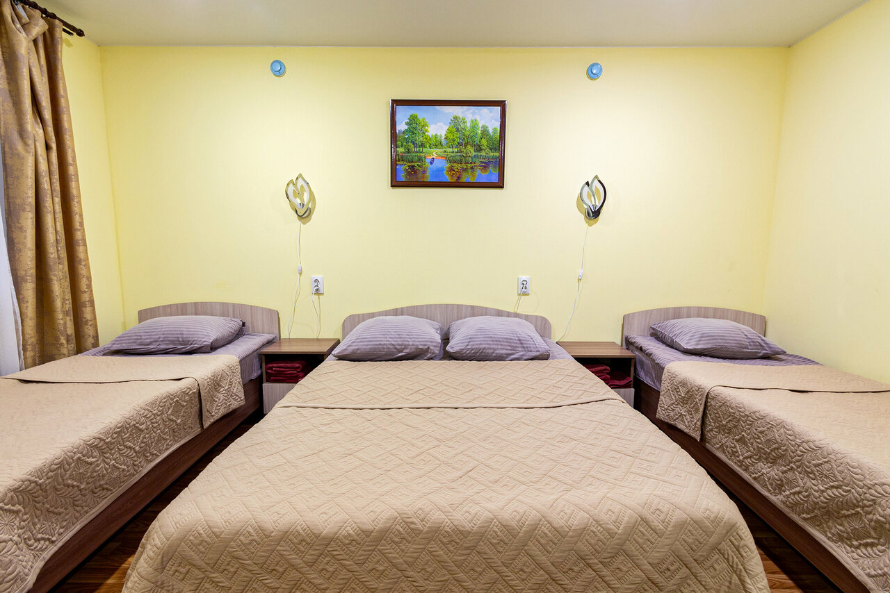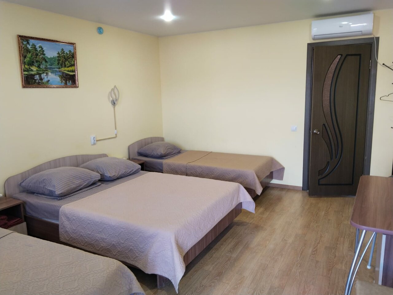 Трёхместный номер в гостинице со всеми удобствами и бесплатной парковкой. Стоимость от 2000 руб., одна двуспальная кровать и одна полуторная кровать, кондиционер, телевизор, душ, микроволновка, чайник, полотенца и средства гигиены.