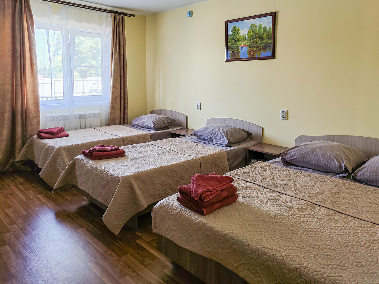 Четырёхместный номер в мотеле со всеми удобствами и бесплатной парковкой. Стоимость от 2000 руб., одна двуспальная кровать и две полуторные кровати, кондиционер, телевизор, душ, микроволновка, чайник, полотенца и средства гигиены.