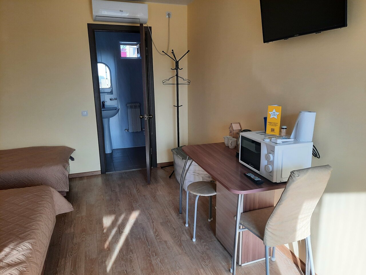 Номер в гостинице до 3-х человек со всеми удобствами и бесплатной парковкой. Стоимость от 2000 руб., одна двуспальная кровать и одна полуторная кровать, кондиционер, телевизор, душ, микроволновка, чайник, полотенца и средства гигиены.