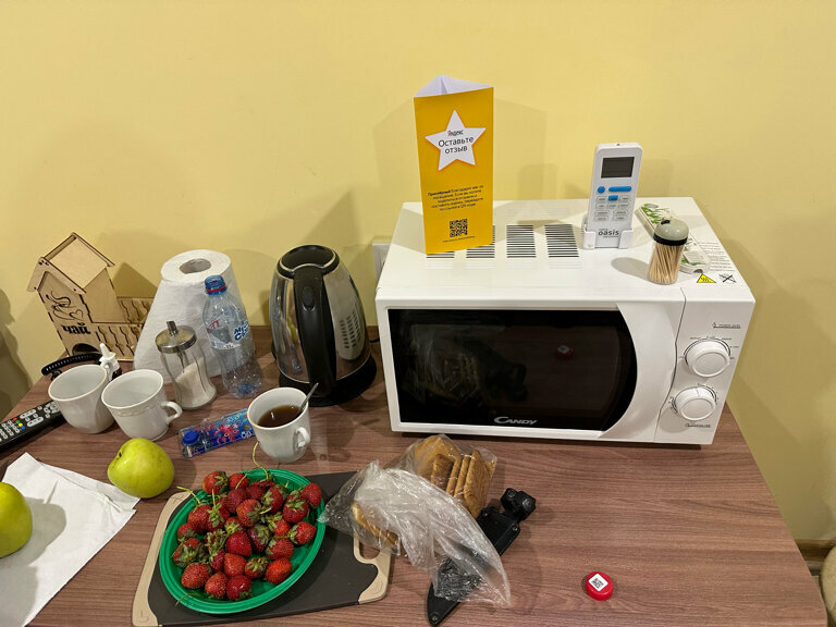 Очень чисто, предусмотрено все, даже полотенце для ножек, кружки, тарелки, ложки… даже чай. Милый дядечка очень заботливо все сделал. Спасибо