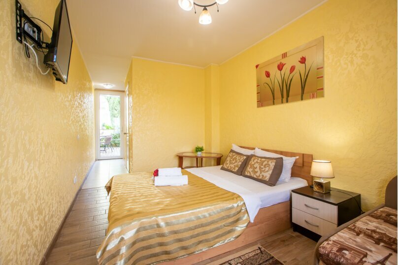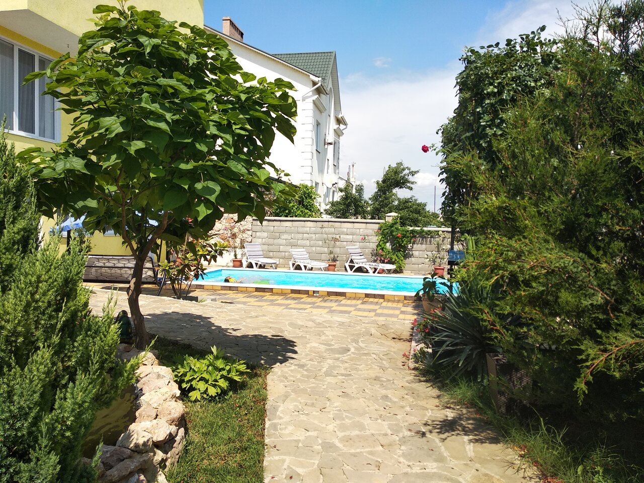Отдыхала в этом году здесь. Лучший отель, который знаю! Хозяйка очень добрая, отзывчивая, приняла как родных! Территория хорошая, много зелени, все цветёт! Есть много места посидеть вечером одному и в компании! Шикарный бассейн с тёплой водой, чистый, ночью подсвечивается разными цветами! Номера хорошие, ремонт тоже, все чисто, аккуратно! Есть питание, женщина, готовит очень вкусно! Для детей есть батут и домик.