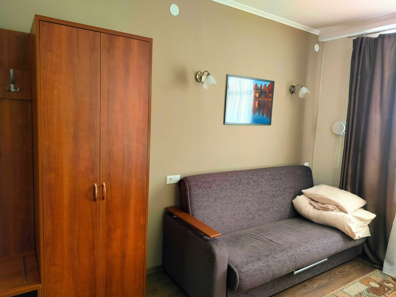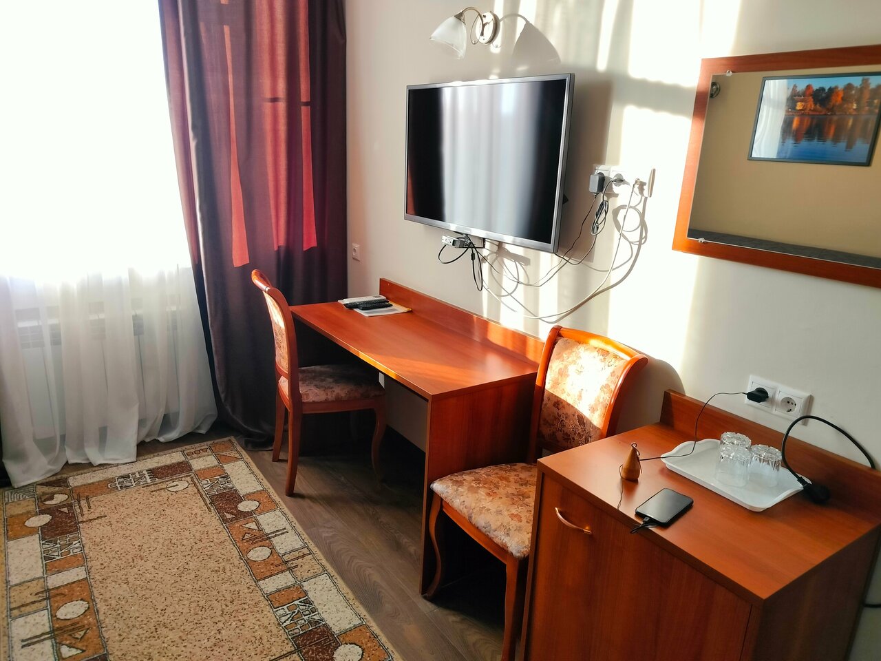 Комфортно, чисто , уютно. Можно поросить чайник в номер или погреть еду в микроволновке, если поздно приехал.
