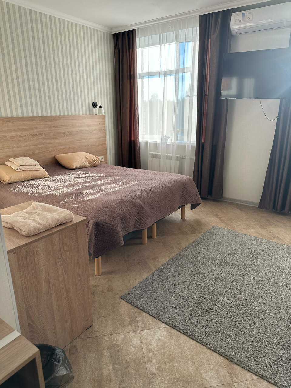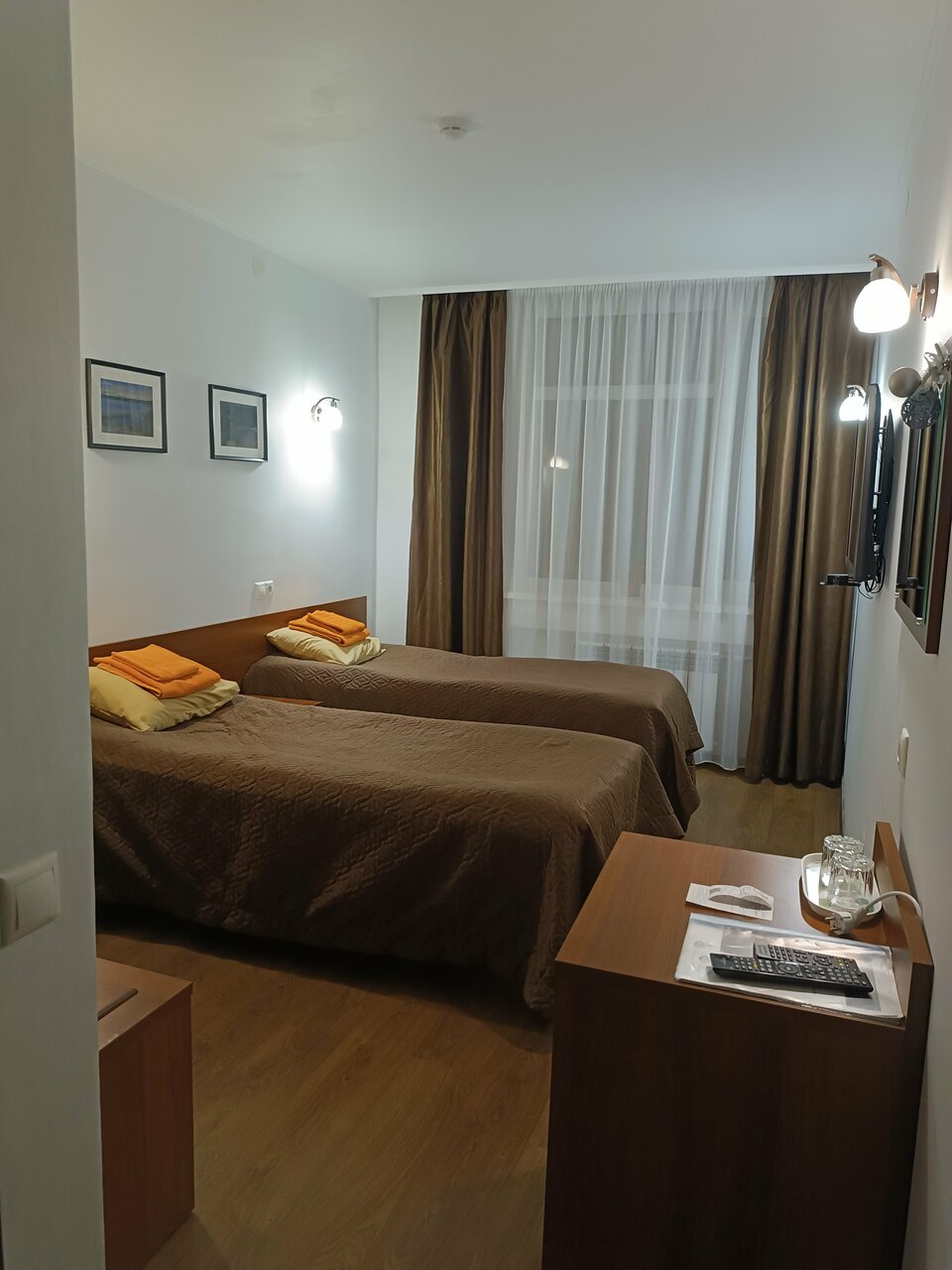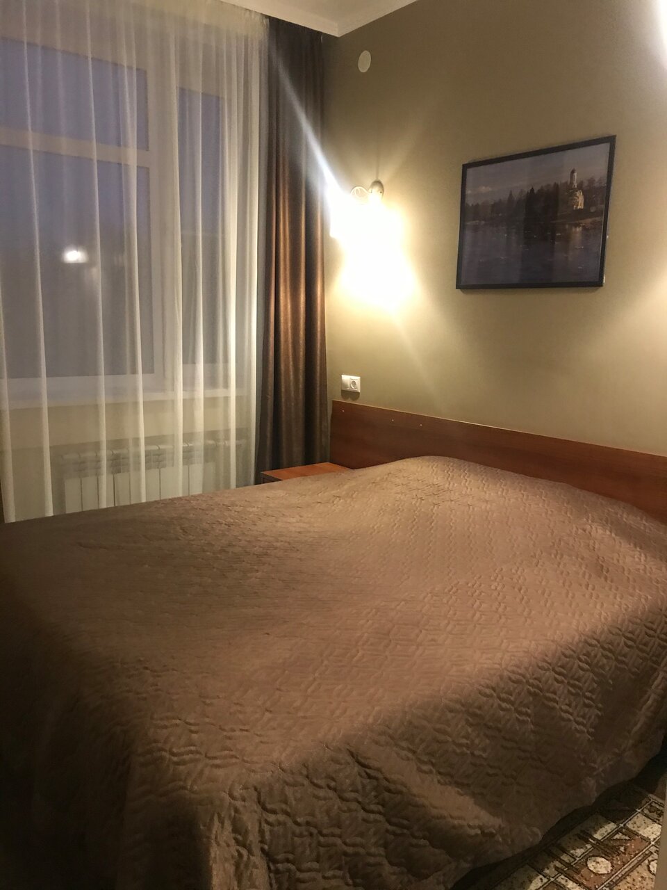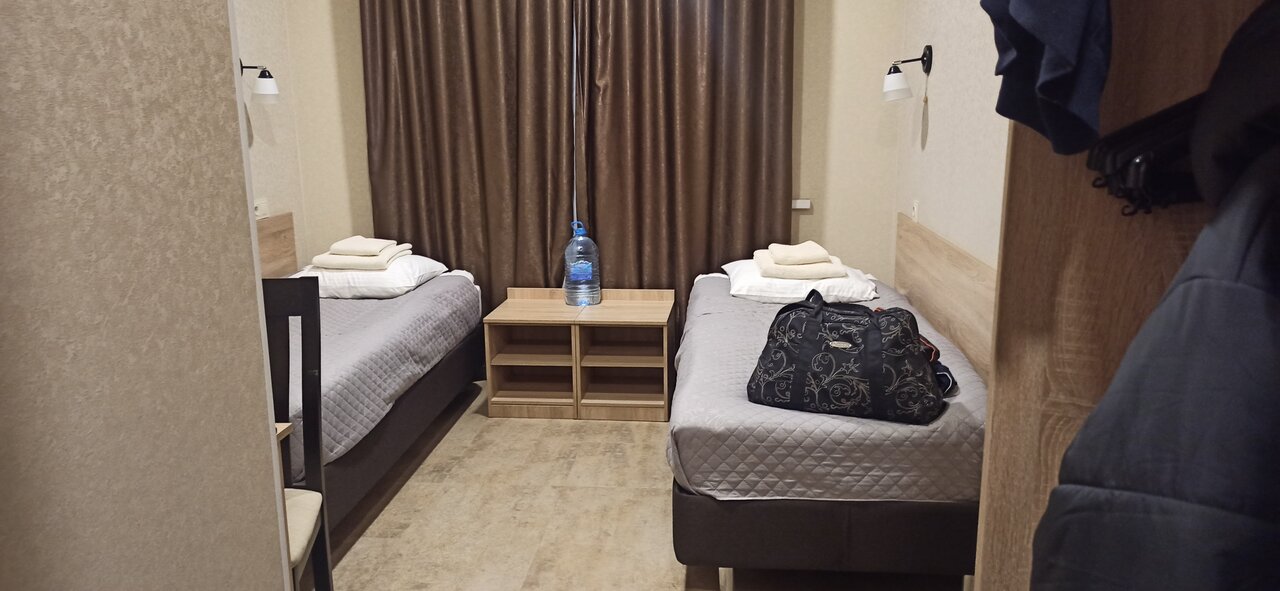 Большой просторный номер. Пол в номере отделан плиткой, нет даже ковриков у кровати, холодный и неуютный пол. Столовая рано заканчивает работу, мы приехали в девятом часу вечера с целью ночлега и остались голодными , и завтрак позновато начинается в 8 утра, нам пришлось ждать открытия столовой, чтобы позавтракать, ведь завтрак входит в стоимость номера, а мы хотели выехать пораньше.
