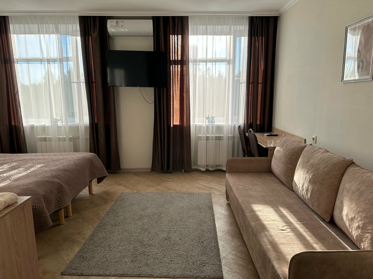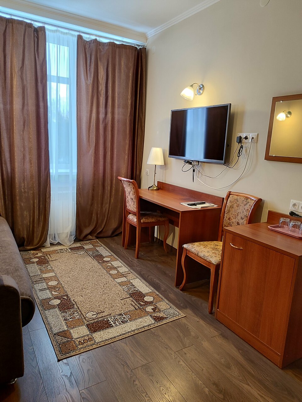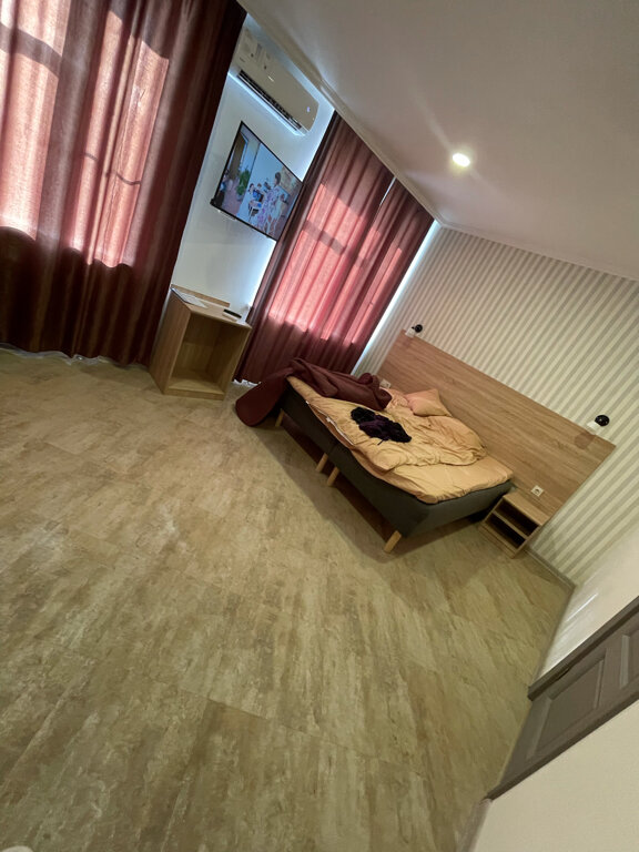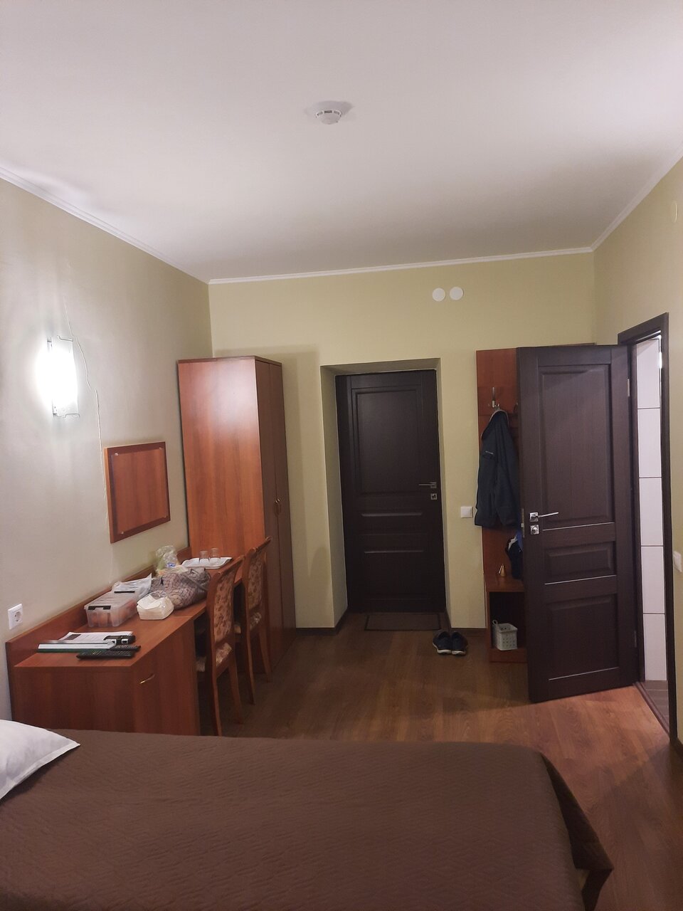 Большой просторный номер. Пол в номере отделан плиткой, нет даже ковриков у кровати, холодный и неуютный пол. Столовая рано заканчивает работу, мы приехали в девятом часу вечера с целью ночлега и остались голодными , и завтрак позновато начинается в 8 утра, нам пришлось ждать открытия столовой, чтобы позавтракать, ведь завтрак входит в стоимость номера, а мы хотели выехать пораньше.