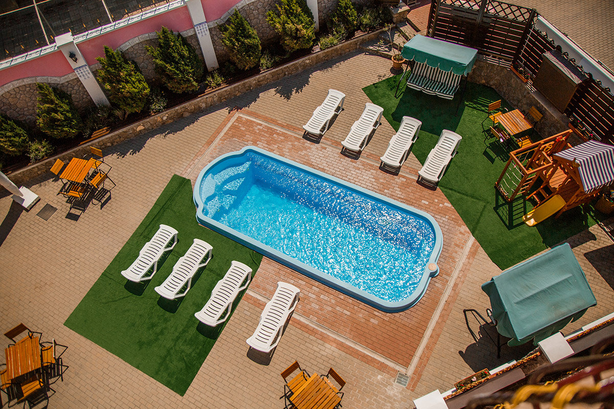 - Наличие бассейна, шезлонгов, беседок.