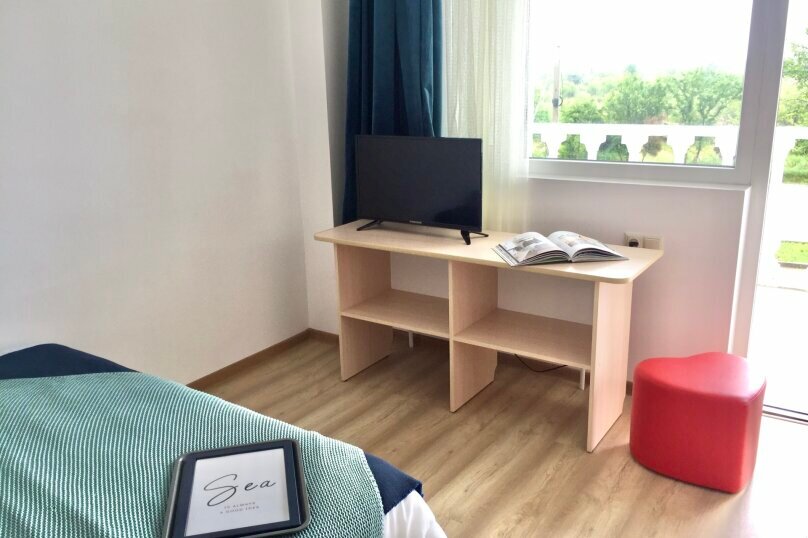 Номер оборудован мебелью и техникой для комфортного проживания: двуспальная кровать и диван-кровать, прикроватные тумбочки, стол, шкаф, зеркало, кондиционер, холодильник, телевизор.В номере имеется Wi-Fi и балкон с летней мебелью, предоставляется по