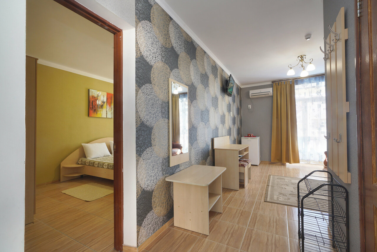 Цены указаны в российских рублях за проживание 1 гостя в сутки возможность размещения до 5 гостей;интерьер 'Комфорт';постоянный Wi-Fi;санузел и душ в номере;спутниковое ТВ;кондиционер;номер из двух комнат;два выхода на балкон;холодильник