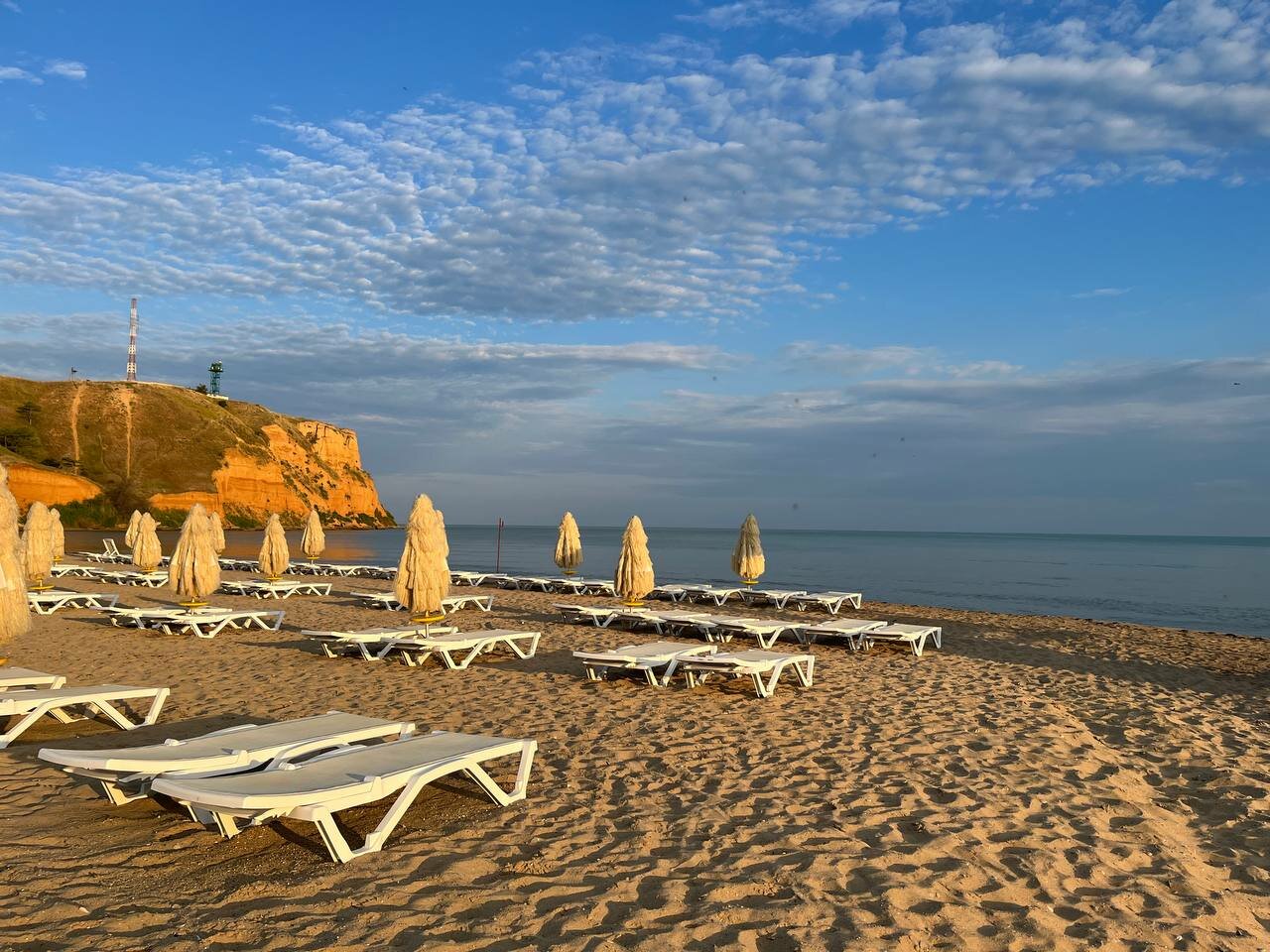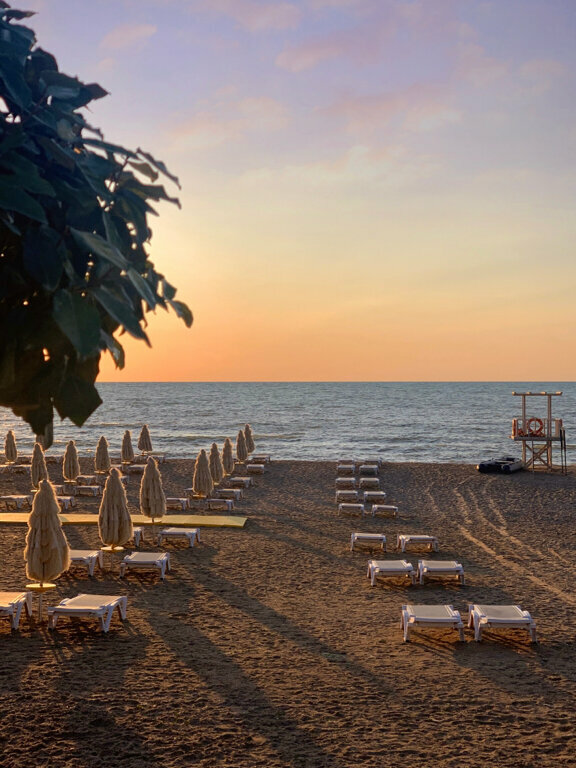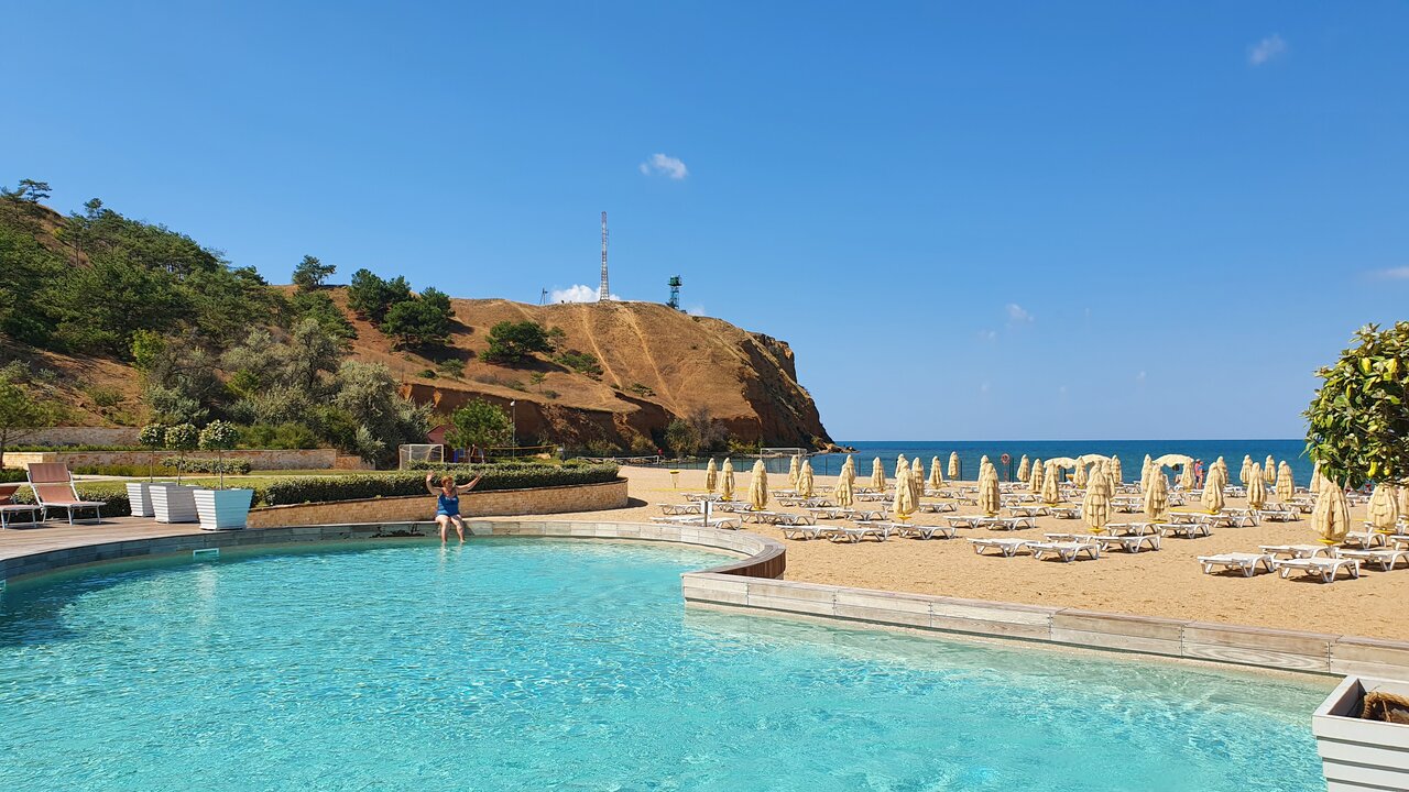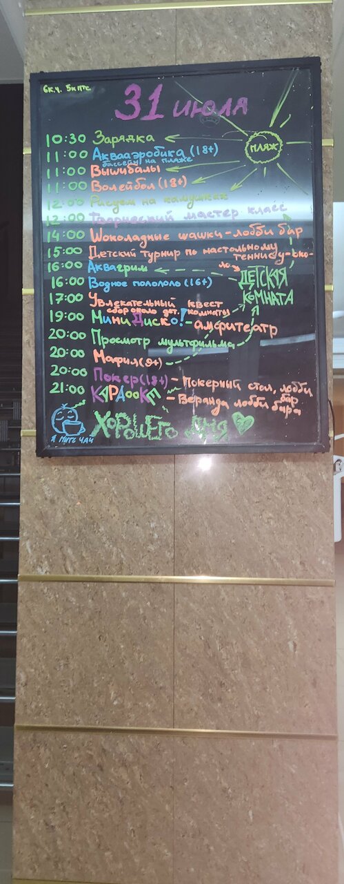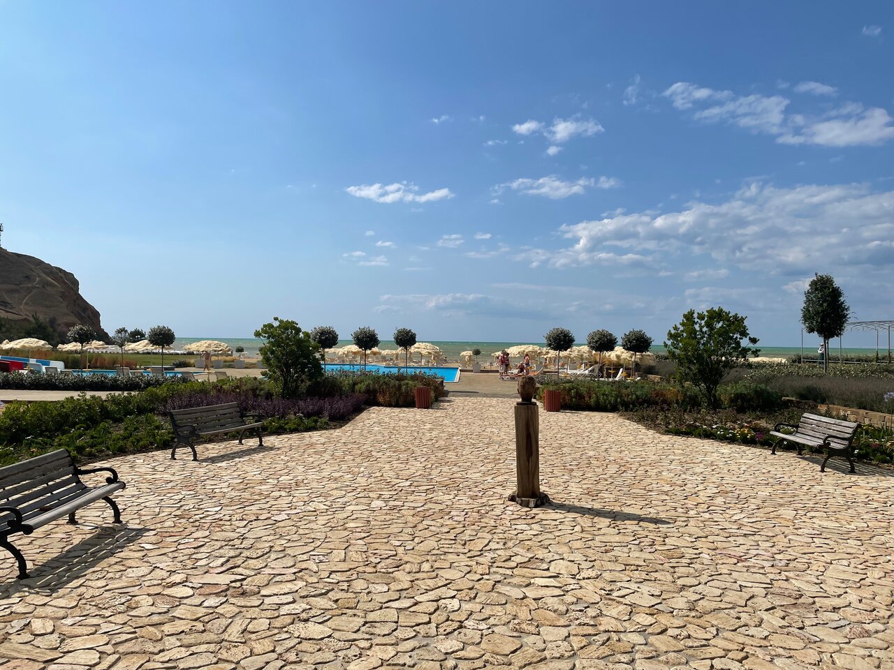 Отель понравился, много семей с детьми, шведский стол, много закусок на пляже и у бара. Для детей огромная площадка, разные мастер классы и занятия. Небольшой зоопарк. Красивое озеро с пеликаном и лебёдями. Паровозик возит на пляж каждые 5 минут. Из алкоголя бесплатно только пиво, остальное платно. И не очень повезло с погодой. Как и во всем Крыме. Первые 3 дня был дождь. Сам отель советую.