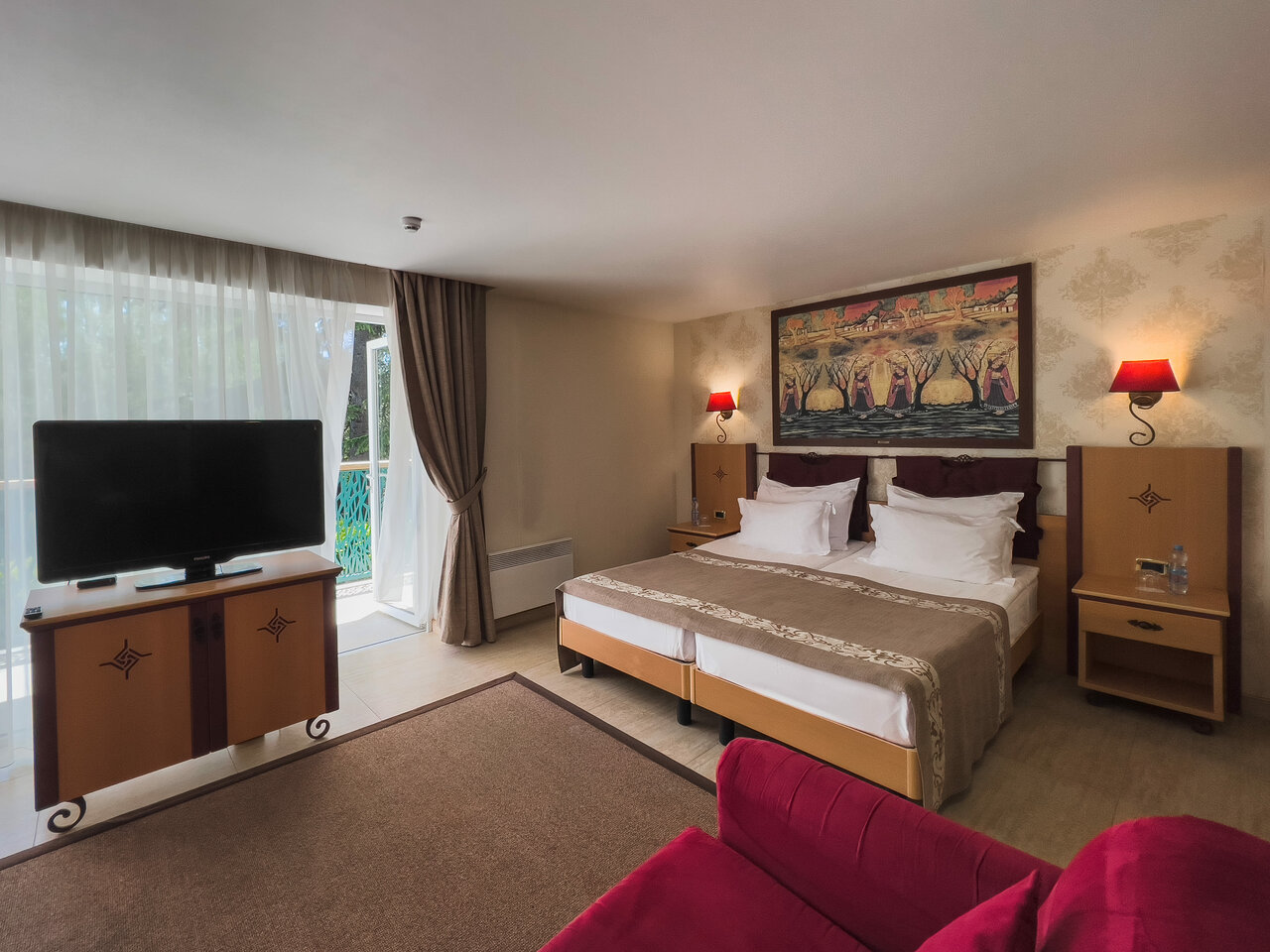 Отличный отель для отдыха с детьми! Брали улучшенный семейный номер, он очень уютный и милый балкончик. На территории 5 бассейнов,горки, анимация, классный песочный пляж, доп.сладости для детей: молочный коктейль, сладкая вата, попкорн. Нашей семье очень понравился там отдых