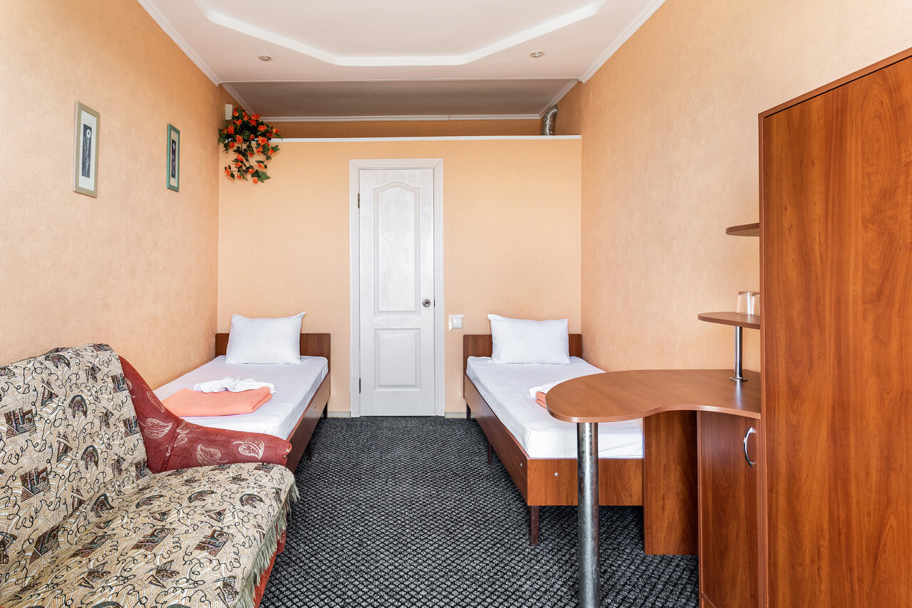 В номере две односпальные кровати, шкаф, прикроватные тумбы, журнальный стол с креслами, кондиционер, телевизор. Сан.узел в номере.
