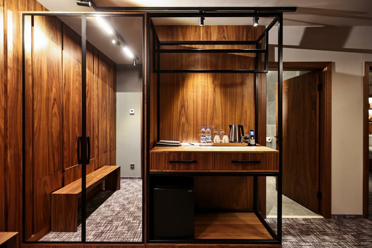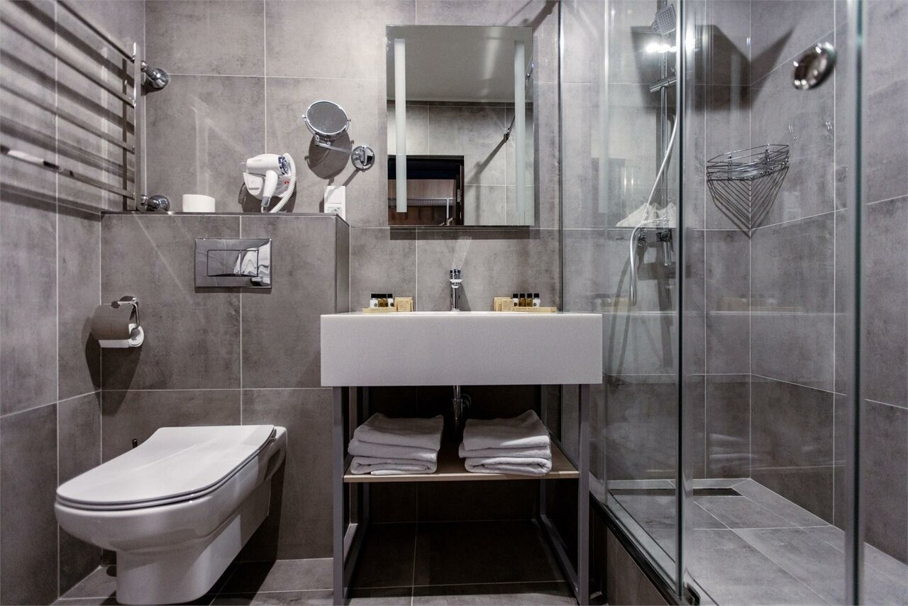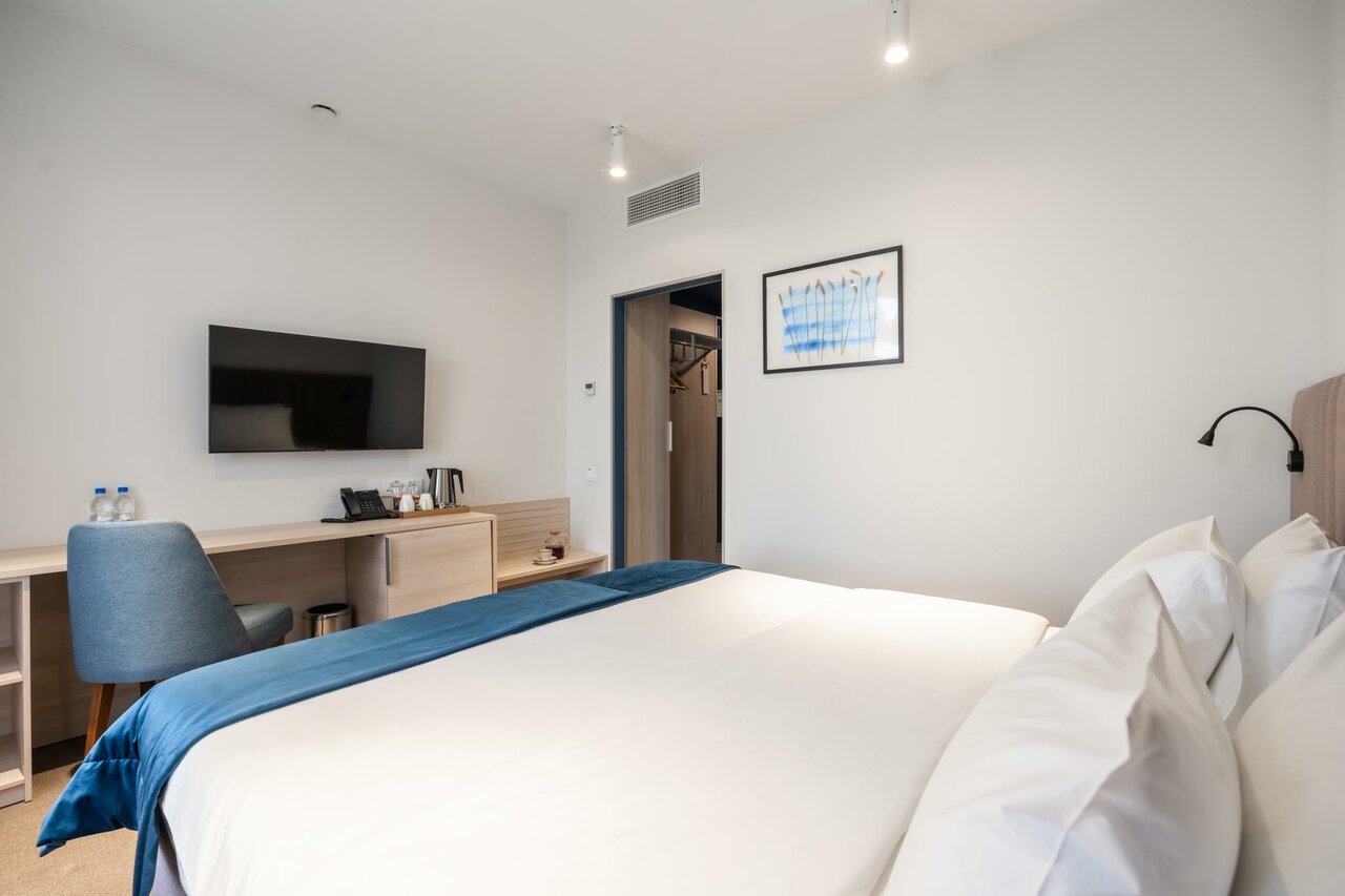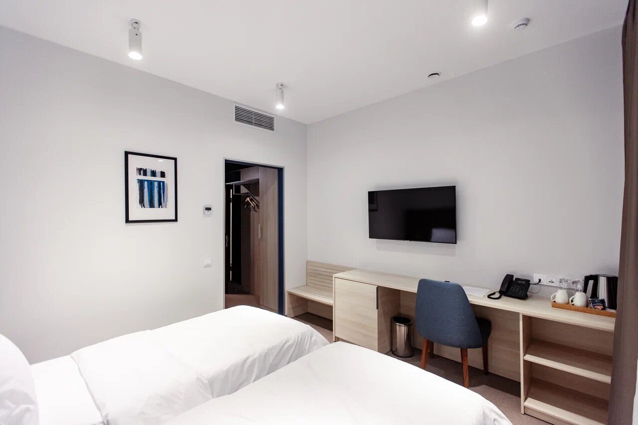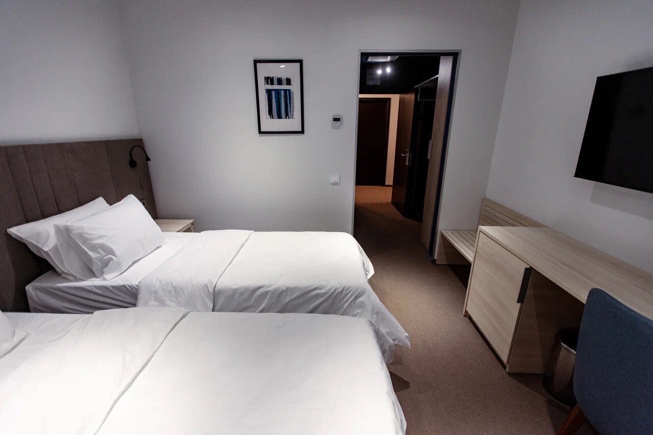 Четырехместный номер, общей площадью 40 кв. м., подходит для семейного размещения до 4 гостей. В номере расположены одна двуспальная и две односпальные кровати, которые имеют ортопедический матрас с независимым пружинным блоком.