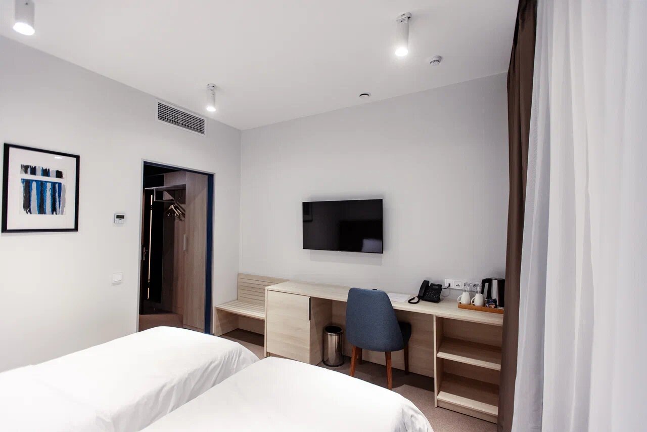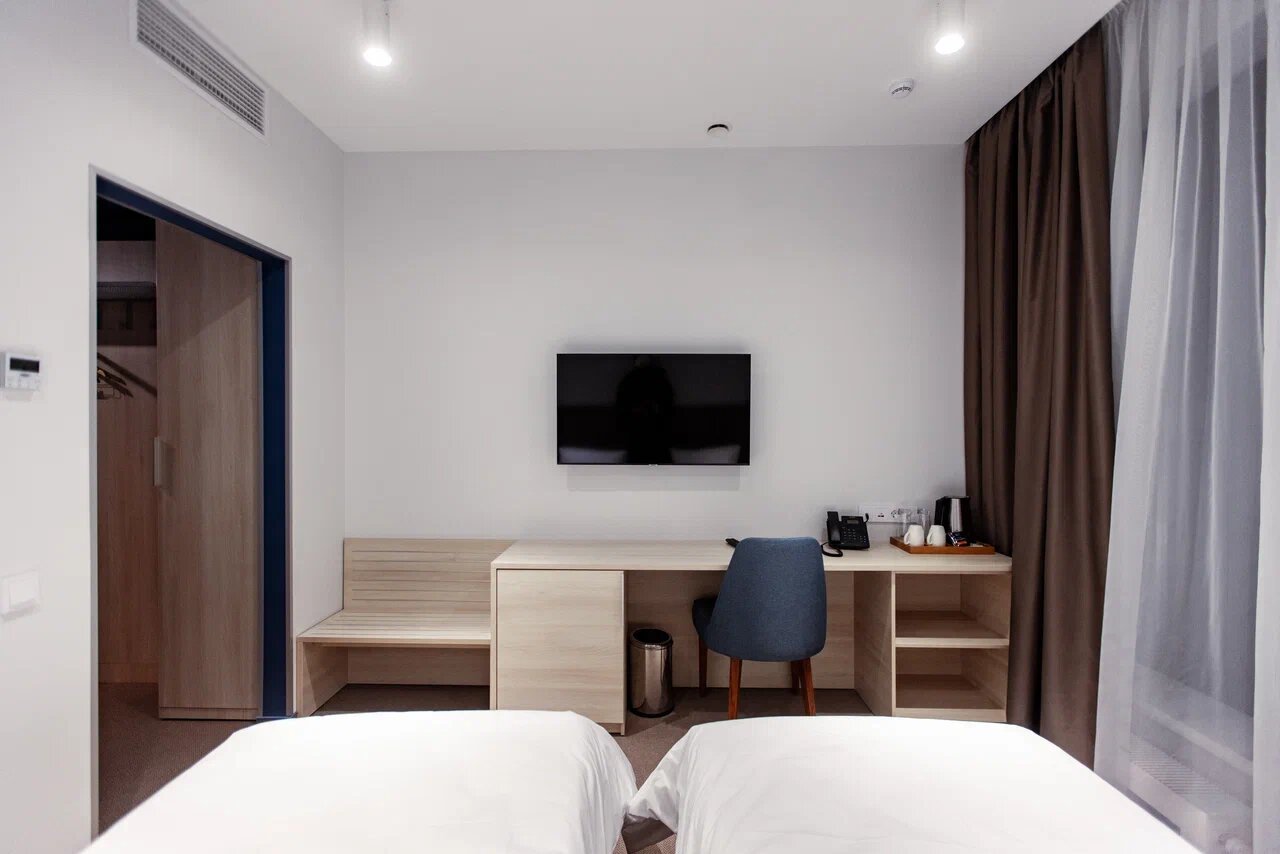 Современный, уютный номер категории 'Стандарт' подходит для проживания 1-го или 2-х гостей. На особо широкой кровати размера 'King size' имеется ортопедический матрас с независимым пружинным блоком. Номер оборудован всем для комфортного проживания