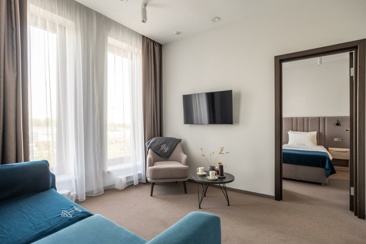 Роскошный, уютный двухкомнатный номер категории 'Семейный полулюкс' подходит для проживания до 4-х гостей. В номере имеется спальня, гостиная с раскладывающимся диваном и большой холл. Каждая комната оснащена Ж/К телевизором.