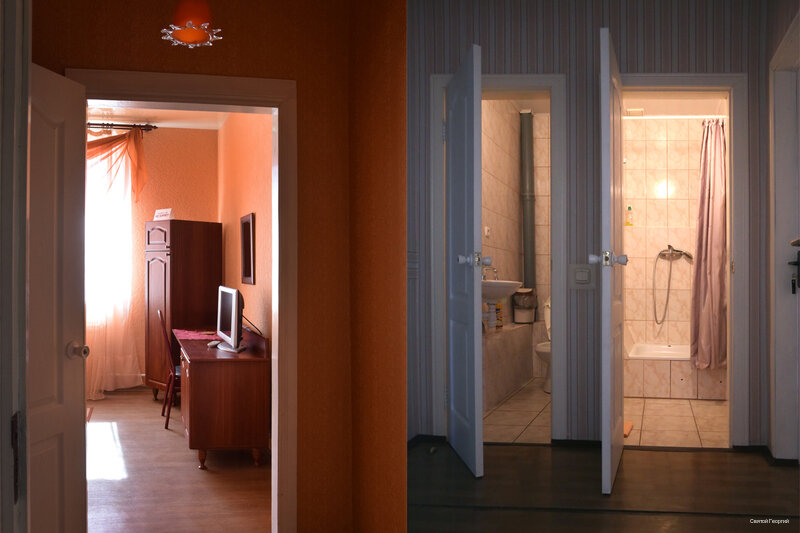 За ранее не бронировали, так получилось. Второй раз я бы там не остановился. Номер на 2 взрослых и 2 детей — 4 т.р. В номере 4 кровати, телевизор и кондей, ВСЁ!!! Даже стаканов нет! В санузле запах! Душ — поддон с занавеской, половина льётся на пол. Питьевой воды набрать негде. Слышимость 100%. Есть кафе, но есть мы там не стали. Единственный + это чистое постельное бельё.