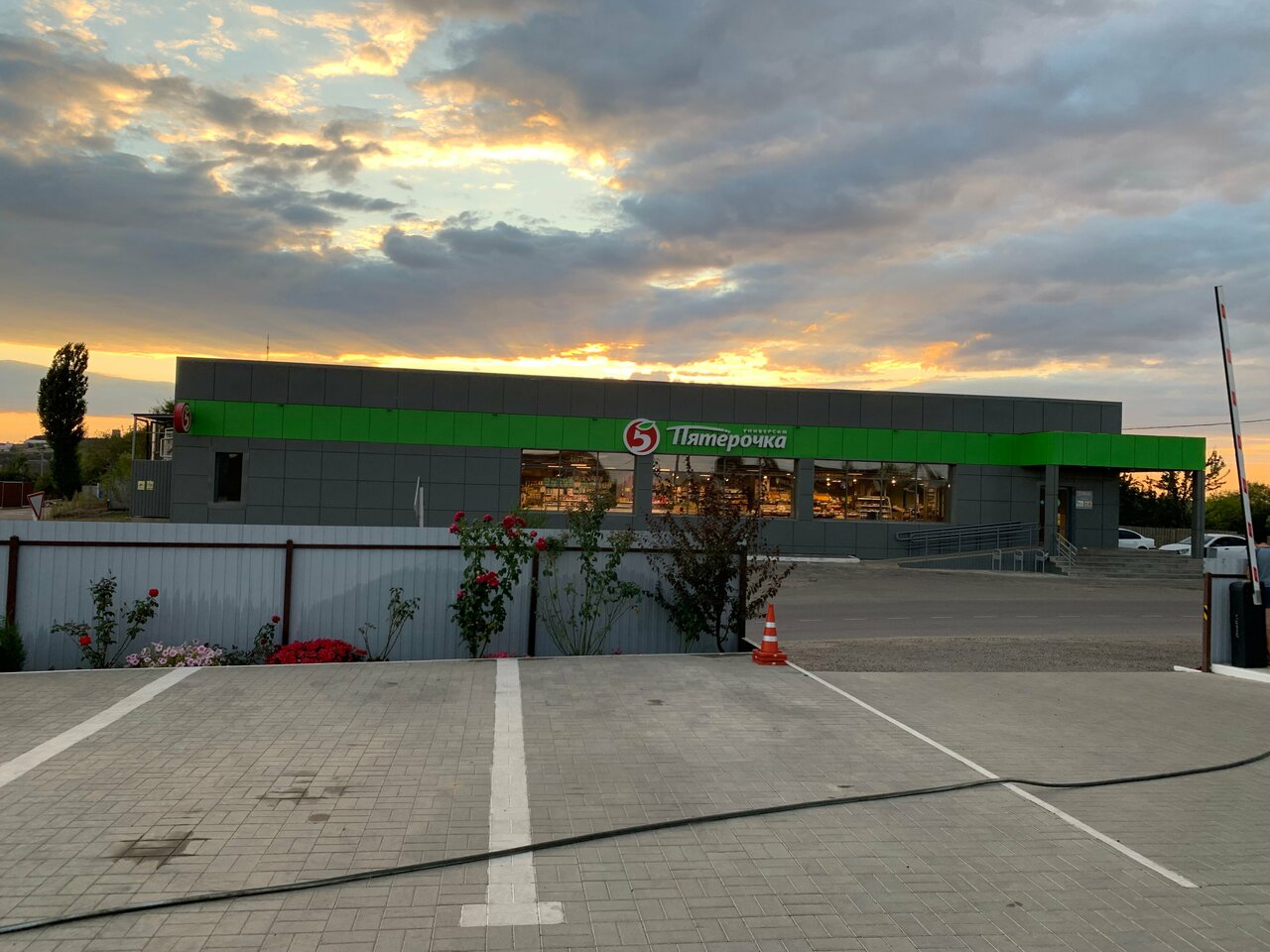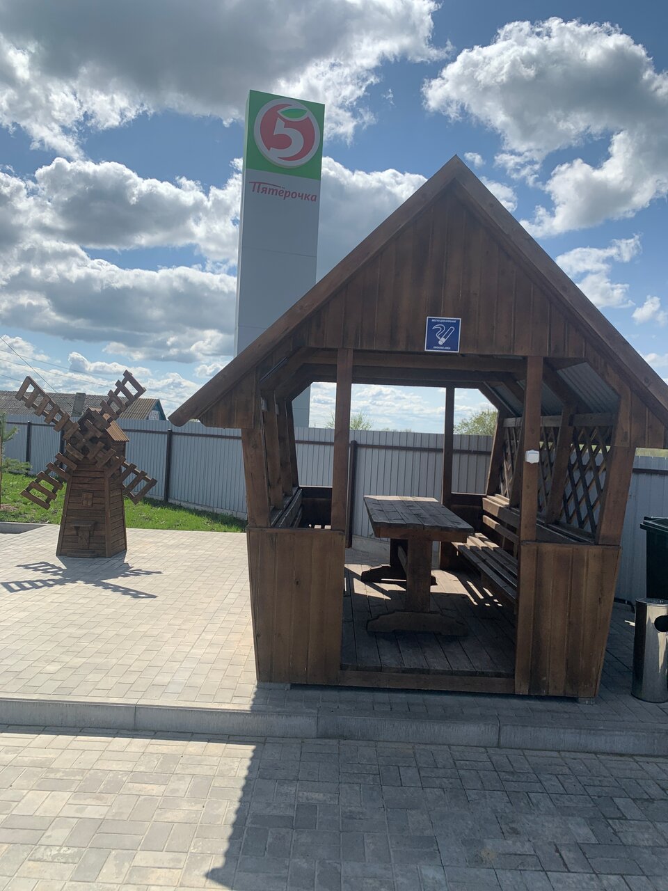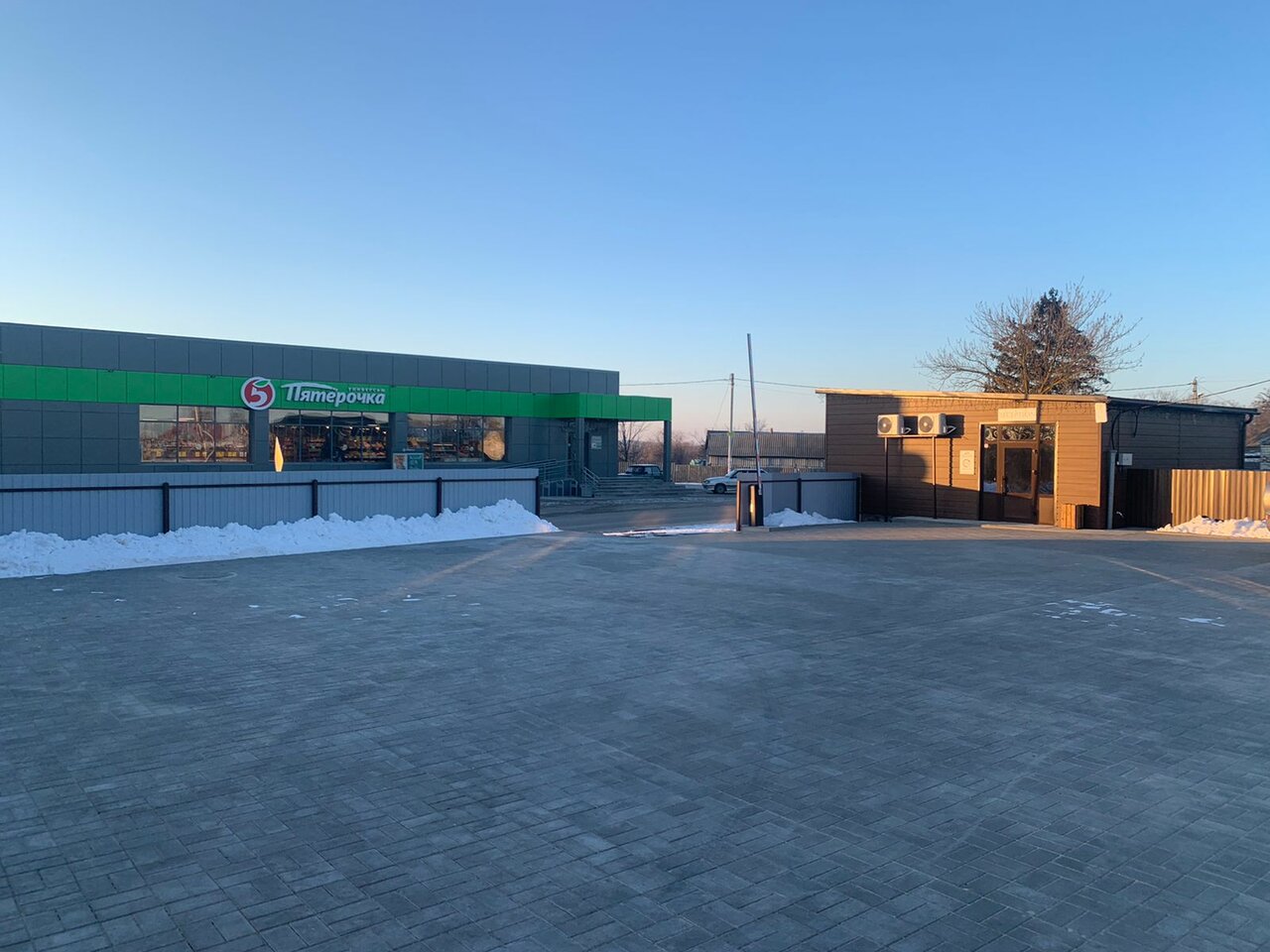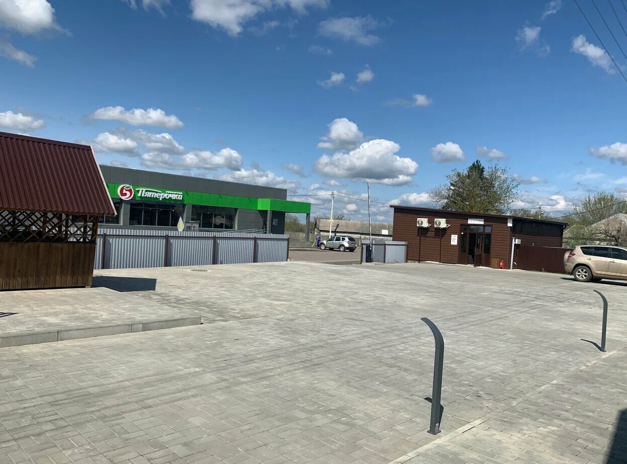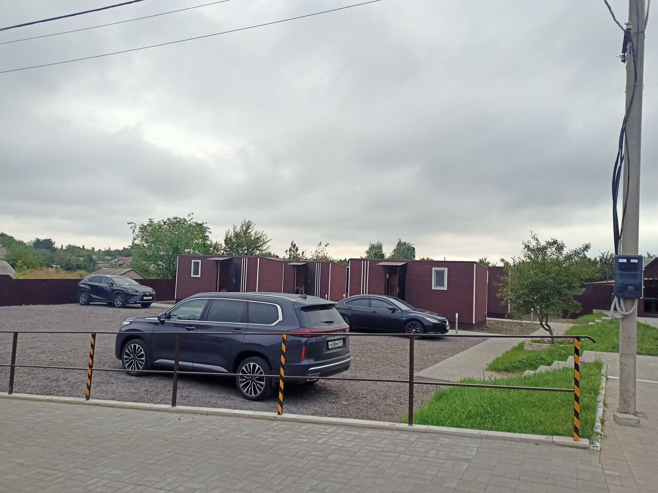Много мест для парковки машин на территории, рядом магазин ‘Пятёрочка’ (через дорогу). Холодильник и микроволновка — хорошее дополнение. В магазине продавали в том числе блюда в вакууме для разогрева. Это всё, конечно, не ‘пять звёзд’, но главные вопросы путешественников закрывает.