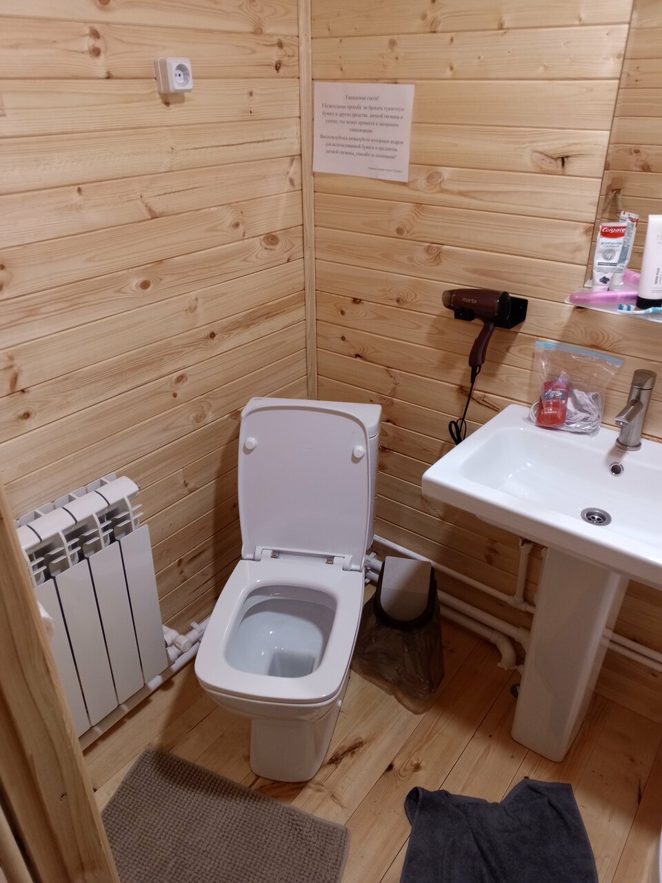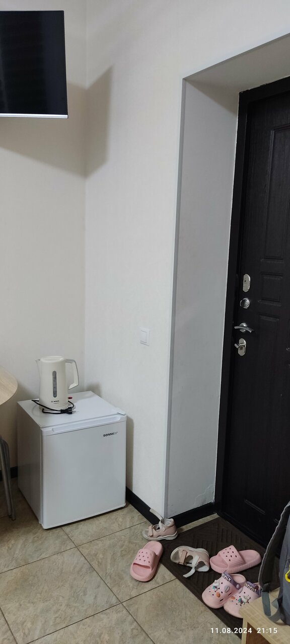 В целом все есть, стоянка, пятёрочка через дорогу. От трассы м4 ехать минут 10 (ночью в кромешной тьме предстоит дорога). В номере кондиционер, телевизор (правда работает 1 канал и тот пропадает), чайник, чашки, холодильник, туалет, душ, необходимое количество комплектов полотенец. Основной, и пожалуй единственный недостаток — ‘картонные’ стены. Были два раза и оба раза нас будили соседи своими разговорами в соседних номерах, по ощущениям казалось что разговаривают в нашем.