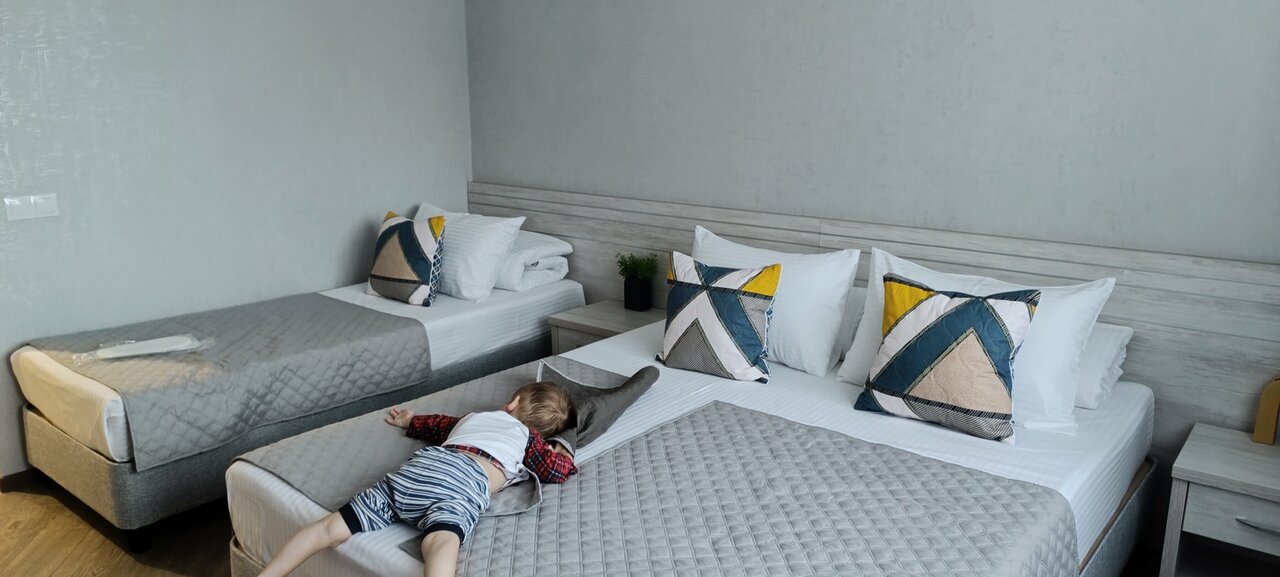 Очнень комфортная гостиница. Останавливались семьей с двумя детьми и собакой. Номнр 4х местный, большой, чистый. Минусов для себя не нашли. Белье, полотенца идеалтно белые, матрасы очень удобные не проваливаются. В номере телек, кондер, чайник, фен. Напор воды в душе отличный. В общем то что нам было ввжно — все соответствует.