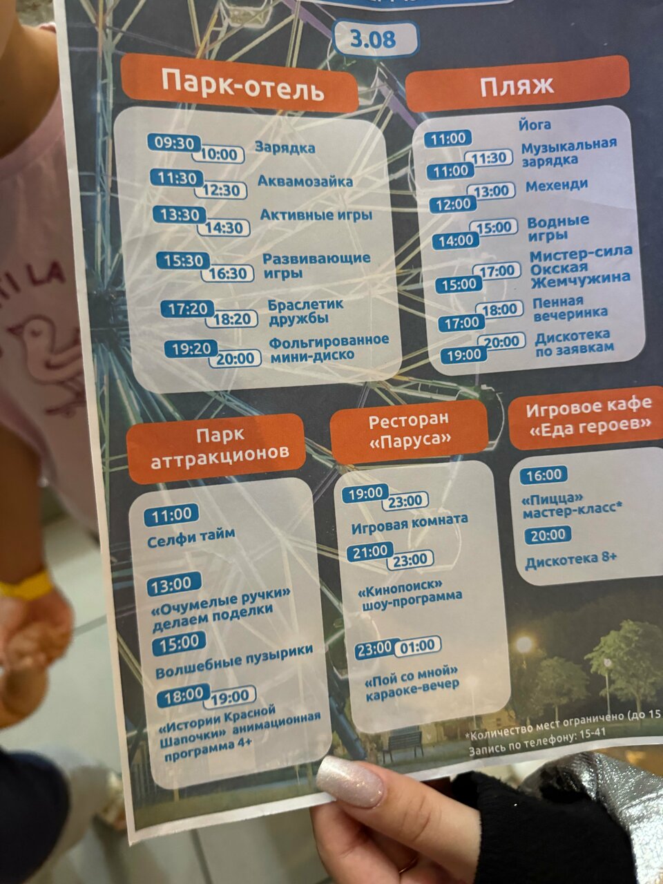 Отдыхали в 2024 году по системе все включено. Еда как в столовой (средняя). Много разных развлечений: аквапарк, тир, велопрокат, веревочный парк, СПА, детские площадки с колесом обозрения, интерактивная зона где можно покидать подушки и порисовать, можно арендовать приставки игровые, также есть пляж с арендой катамаранов, сапов, беседок на воде. В целом все очень понравилось, из минусов: раздолбаный тренажёрный зал, раздолбаные велосипеды и отсутствие дорожек где на них покататься, еда могла бы быть лучше. Из плюсов также много детской анимации, есть детская игровая комната, где можно оставить ребенка. Вообщем если устранить минусы и добавить еще активностей вообще будет огонь .