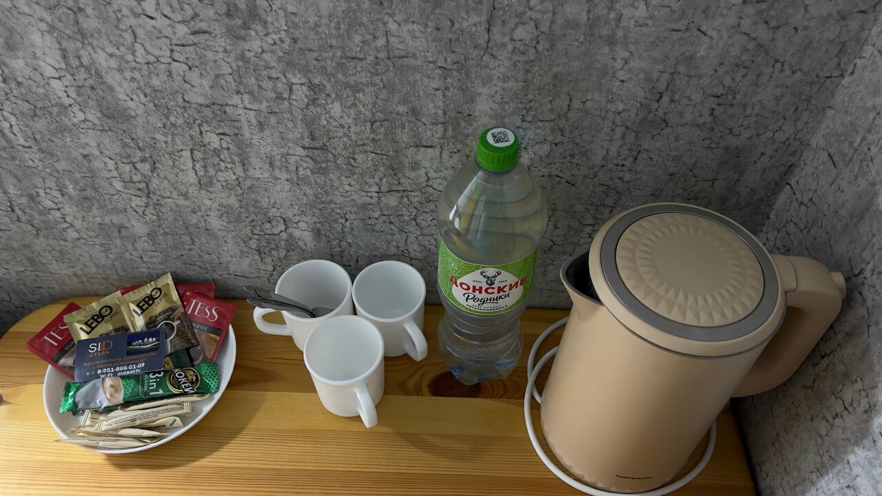 Расположен в 1км от трассы М-4, заехать можно как со стороны Москвы, так и со стороны Ростова. Большая стоянка. Удобные ступеньки к номерам. Номера площадью 20-25квм. Внутри одна широкая кровать и две одинарные, матрацы средней жесткости, не скрипят, спать очень удобно. Мебель из дерева. Небольшой столик и два стула. Вместо громоздких шкафов — вешалка-стойка, есть маленький холодильник. Санузел идеально чистый, сантехника исправна, в душевой хороший слив. Фен и по 4 шампуня и геля для тела. Центральное отопление- в помещении +23. Белье новое, чистое, на каждого по 3 полотенца. На столе чайник, 4 чашки с чайными ложками, пакетики с чаем, кофе, сахаром, 1,5л бутылка питьевой воды. Все это за 3000 р.