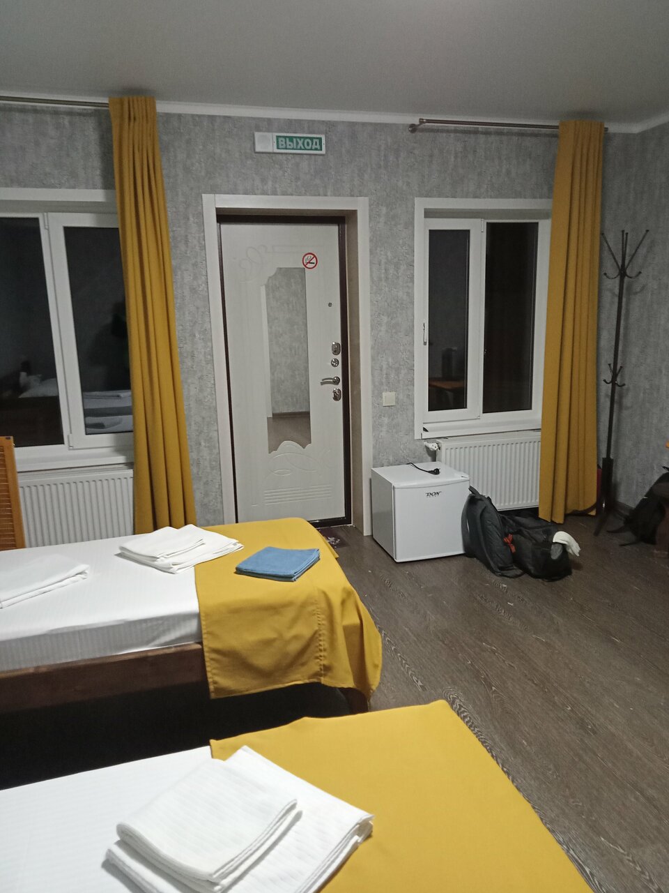 Очень хороший отель! Новый. Всё сделано с душой, ни на чём не сэкономлено. Все номера на 4-5 человек. Большая двухспальнаякровать и 2 односпальный. Для семьи, то что надо. Отличный ВайФай. Огромная парковка. У на был большой прицеп, развернулись за один приём. Из недостатков, в этом месте плохо ловит Билайн.