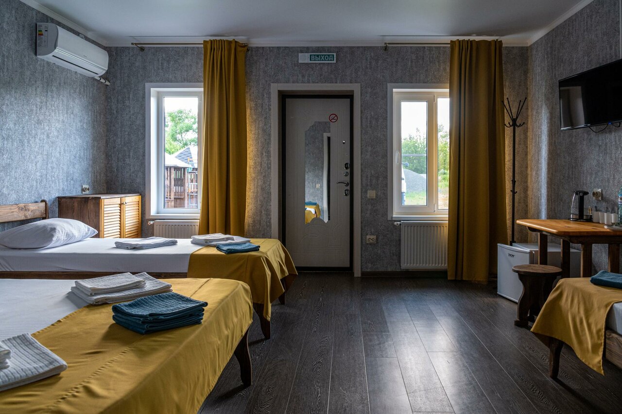 Услуги: — Номера (2500–4000 ₽/ночь) с кондиционером, санузлом, холодильником, ТВ, Wi-Fi, чай/кофе. — Бесплатная парковка, общая кухня, баня, площадка для пикника. — Трансфер, фен, тапочки, уборка. — Питание не включено.