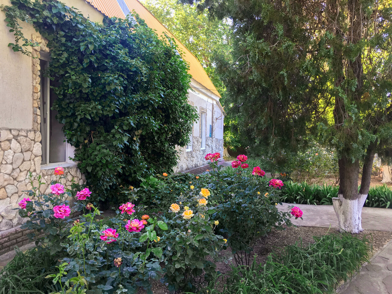 Очень грязные и уставшие номера,с плесенью. Плохая подача воды и затхлый запах. Отсутствуют москитные сетки, так что готовьтесь к большому количеству насекомых в номере. Еда: были разваренные макароны и непрожаренная котлета. До пляжа идти минут 5,но если по времени совпадёт с детским лагерем, то места будет мало. Море было грязное, но тёплое. Пляж-мелкая, острая ракушка и тёплый ковёр из водорослей на берегу. Один магазин, работает с 1 выходным в неделю(понедельник) Вносили предоплату, но её так и не вернули. Интернет работает с перебоями. Телевизор маленький, но даже не включали. Как работает не знаю. Не рекомендую.