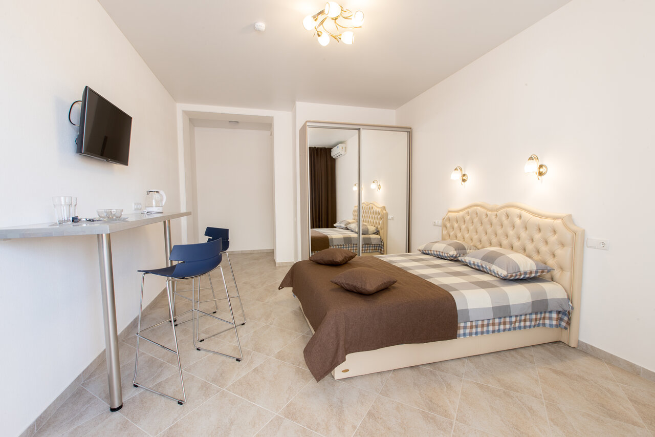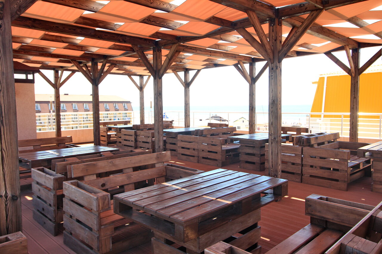 - Низкие цены за качество.; Современная мебель и чистые полотенца.; Вкусное питание в столовой отеля.; Терраса на крыше с видом на море.; Хорошее расположение (рядом магазины, набережная, аквапарк).