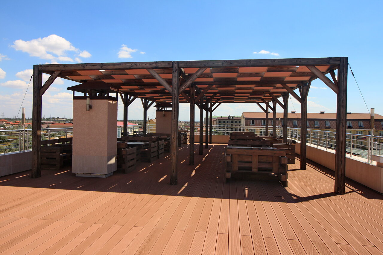 Всё хорошо. Чисто. Понравилось что есть крыша, на которой есть мангал, можно посидеть, позагорать. Минут только то, что в сентябре уже не работала кафешка, а так всё норм.