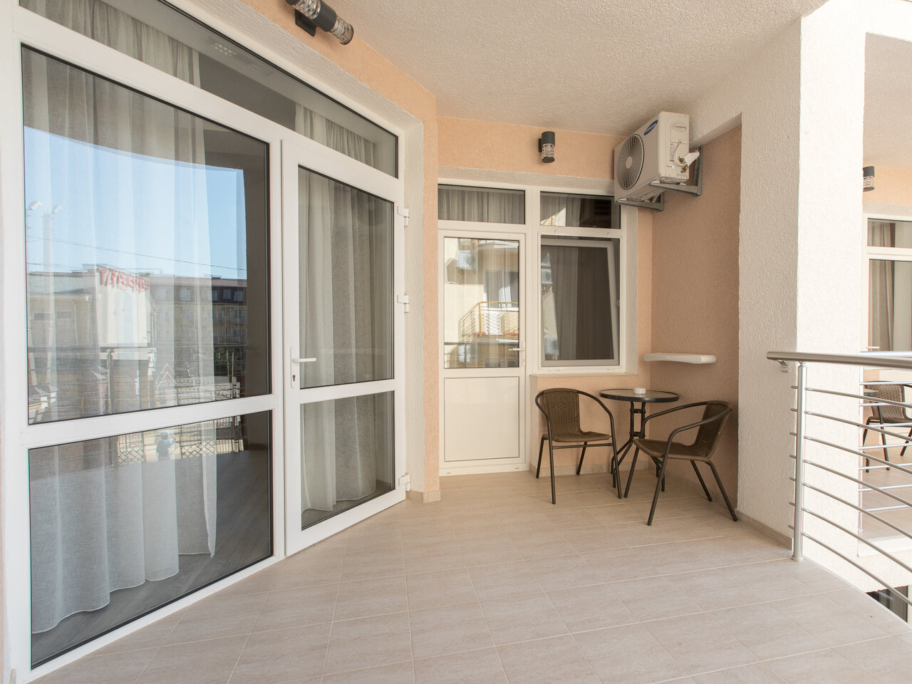 Двухместный номер с балконом, включает двухспальная кровать, кондиционер, ТВ, холодильник, чайник, шкаф, стол, санузел.