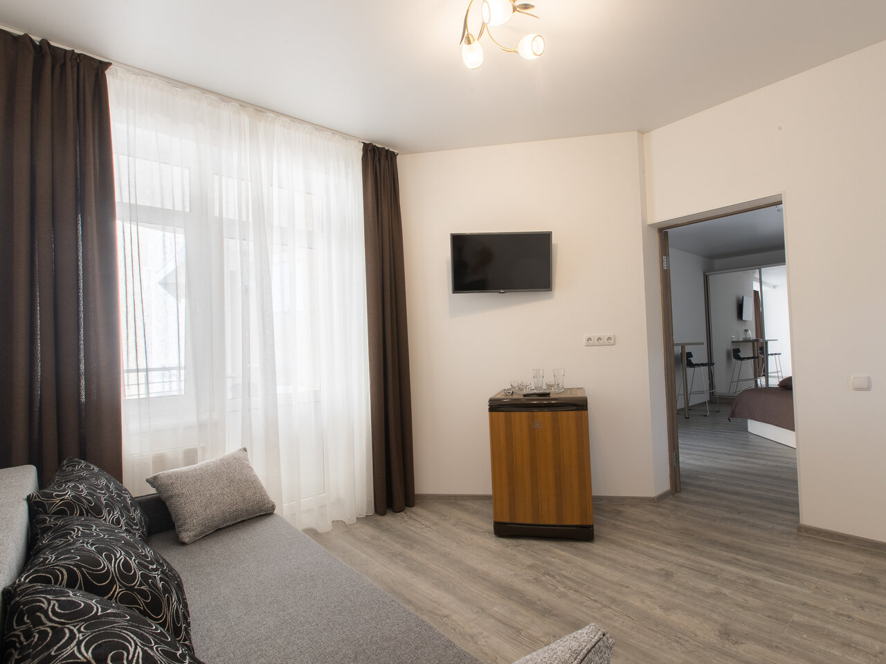 Отдыхали в июле 2024г. Брали двухкомнатный люкс с балконом. Просторно, уютно. До моря три минуты неспешным шагом. Замечательный, отзывчивый персонал! Отличный отель! Приедем ещё.