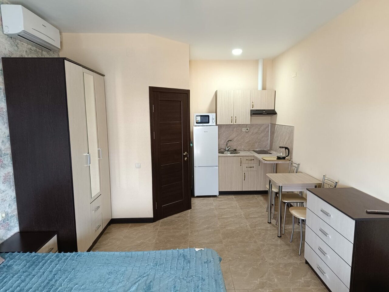Двухместный номер Стандарт с одной кроватью, мини-кухней, собственным душем и санузлом.