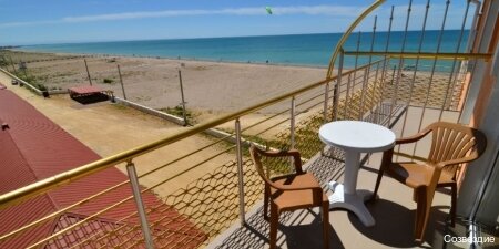 Хорошая гостиница. Номера комфортные. Цены умеренные. Море в 100м. Пляж огромный. Недалеко база отдыха Прибой. Удобная транспортная доступность — ж/д платформа Прибрежное, автобусные остановки. До Евпатории и Саки 15 минут. Народу на пляже не очень много. Сам пляж просто великолепный — мелкий ракушечник с мелкой галькой.