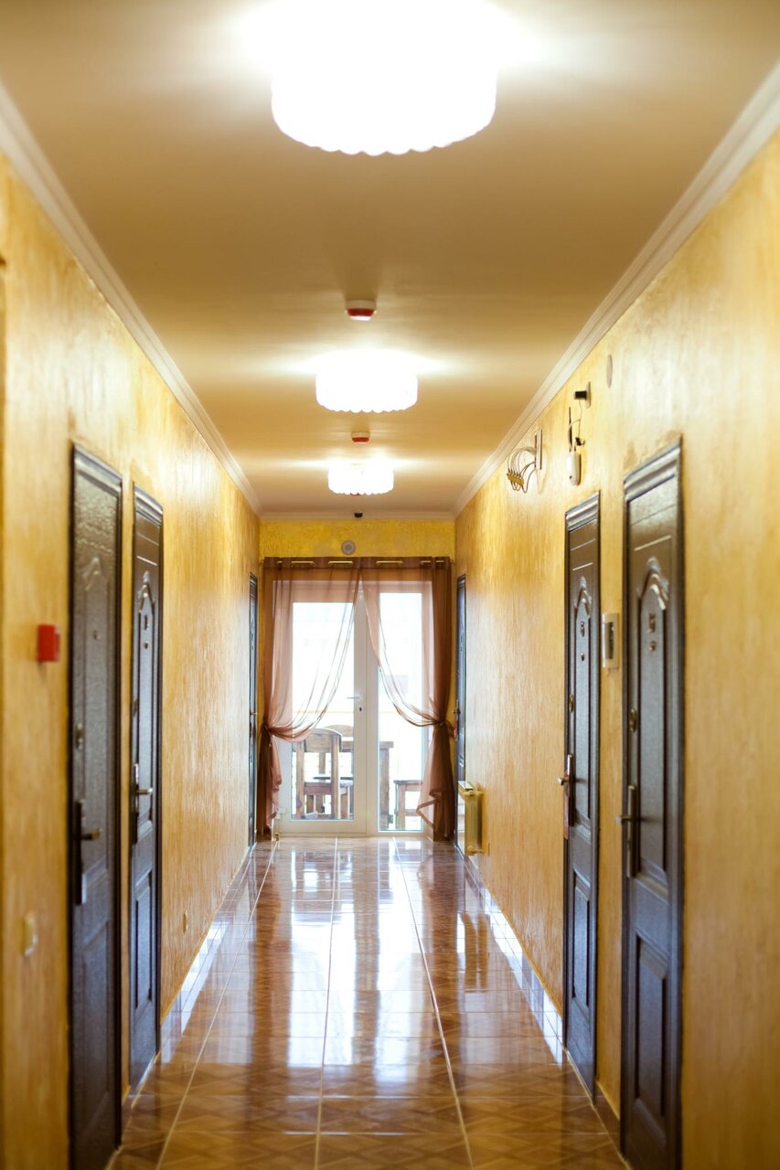 Внутри все чисто аккуратно, матрац хороший,холодильник чайник все есть, есть столовая за отд плату, либо за сутки предупреждаете о том что будите кушать, есть мангальная зона, единственное у нас был номер с боковым балконом, балкон очень маленький, и если кто то будет жарить шашлык внизу и ваши вещи будут висеть сушиться, то дым от мангала обязательно пропитает вещи, вода в душевой серная присутствует запах и слабый напор, а в целом отель рекомендую. Да ещё немного неудобно было большой пластиковый стол котоый приходилось двигать тк он либо мешал выйти на балкон либо мешал просмотру тв если лежишь на кровати, стол надо наверное какой то поменьше типо журнального, чтоб можно было перекусить и что он мешал.