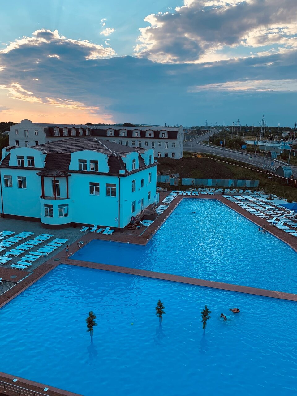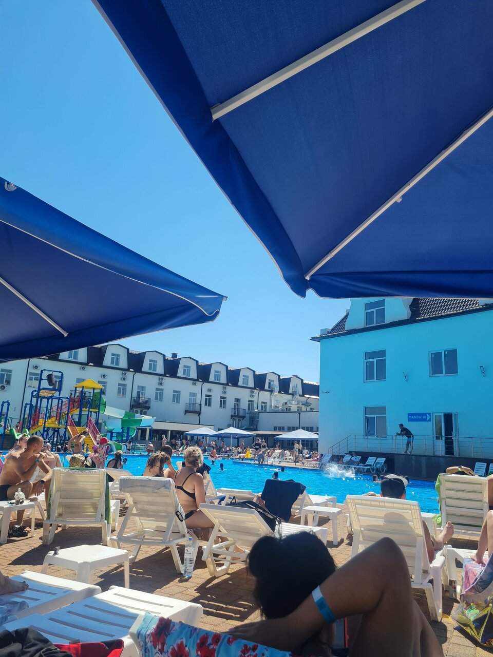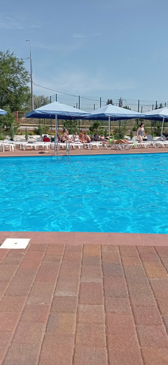 Чистые бассейны, взрослый вполне плавательный) нормальные лежаки, чистый туалет) из еды брали пиццу, шаурму и соки-неплохо, чуть дороже чем в городе, но не намного. Единственное, что изрядно раздражало- дорога сразу за забором и всё-всё видно, пыль с дороги нечем затормозить, т.к. кустики малюсенькие ещё.