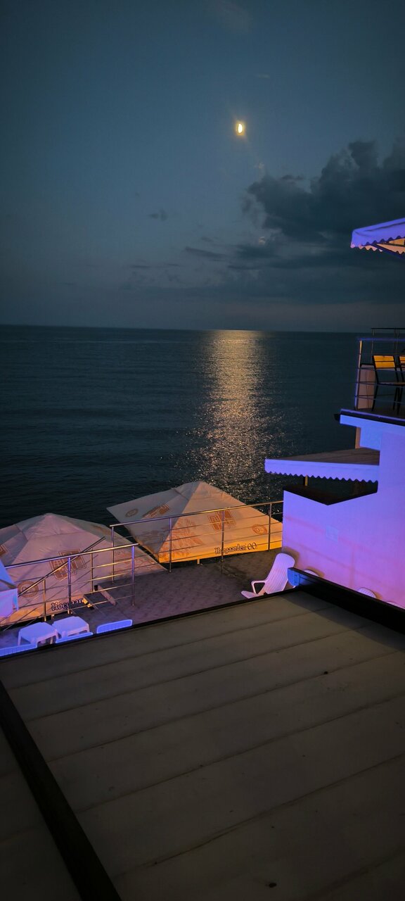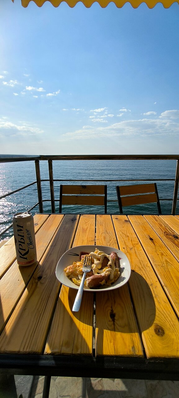 - Хорошее разливное пиво.; Ухоженная территория.; Терраса с видом на море.; Быстрое и приятное обслуживание.; Наличие магазинов рядом.