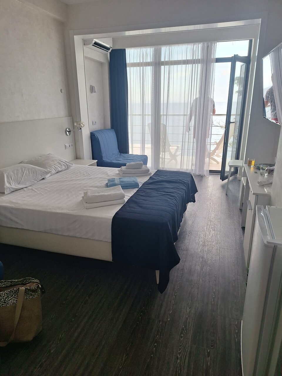 Отличное состояние номеров, всё новенькое, чистое, большой смарт тв, тихий кондиционер, вкусная еда в кафе на территории. Есть небольшие магазинчики, всё необходимое можно купить никуда не выезжая. Каменистое море, но есть небольшой бассейн который выручает.