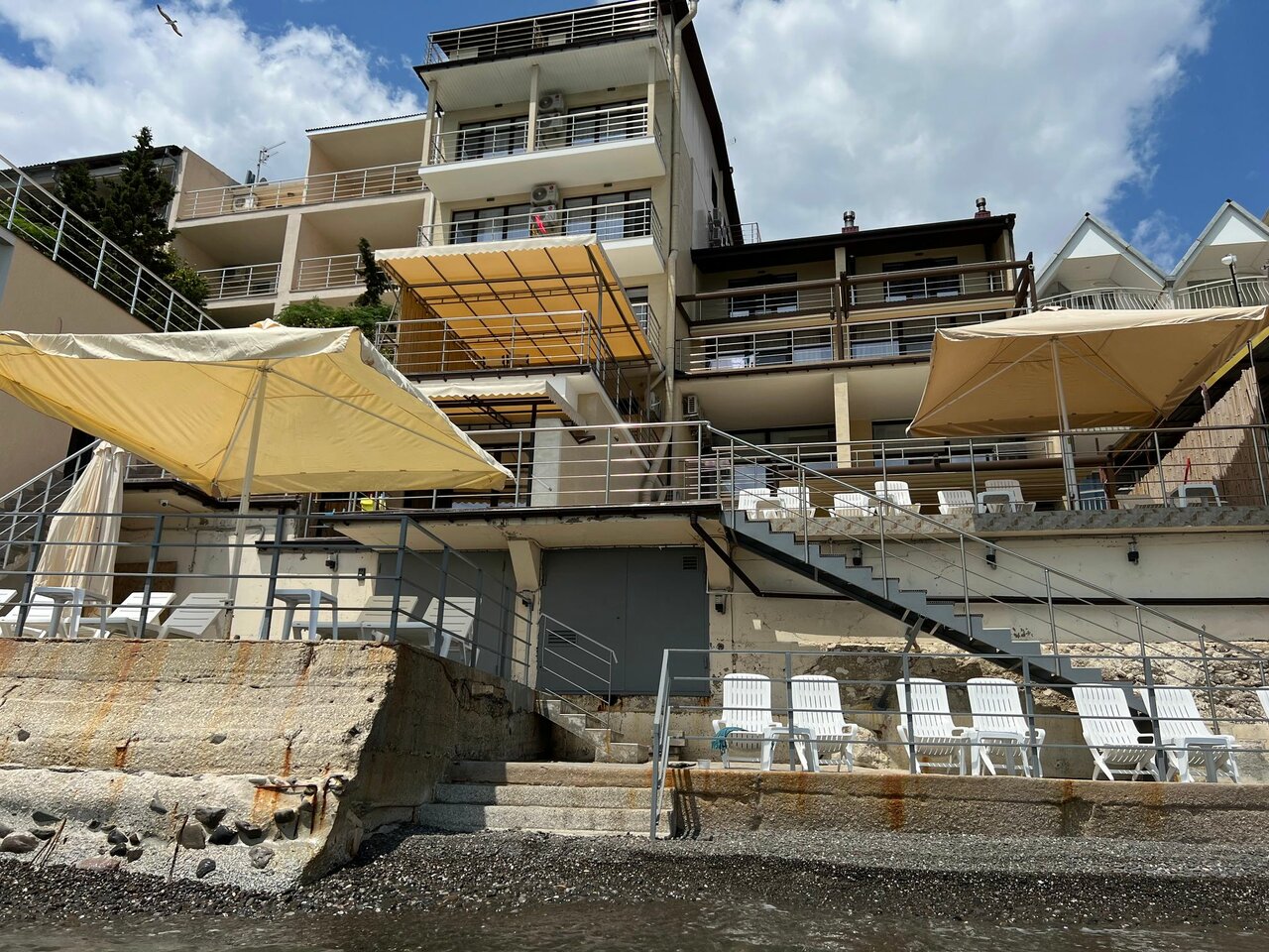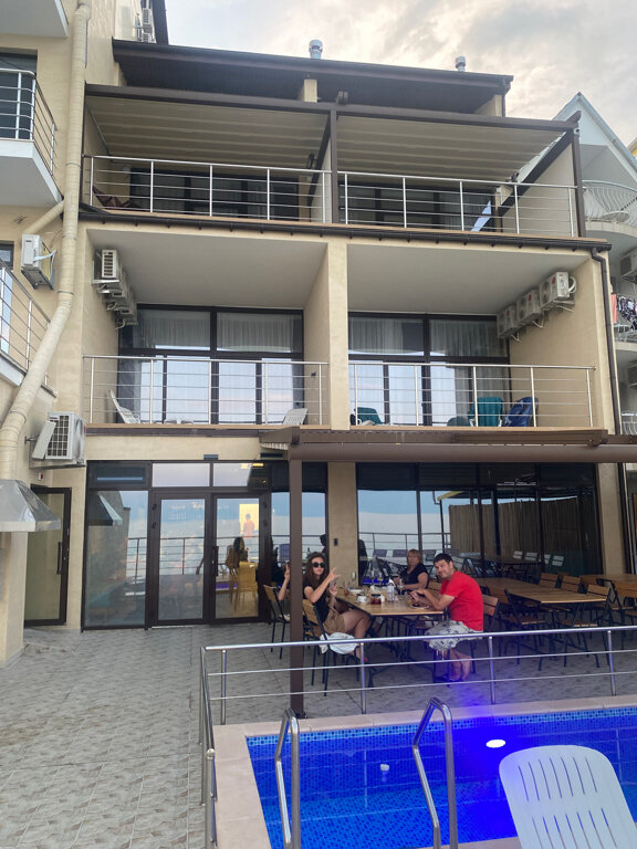 Отличный вариант на берегу моря, на территории есть ресторан с большим выбором блюд и хорошей кухней. Так же есть кухня для желающих готовить самим, со всей необходимой посудой, плитой и холодильником. Номера новые, ещё ремонтом пахнет) очень свежие белые и красивые. Все необходимое есть. Обслуживание отличное, видео, что переживают за свое дело!) Расположен прямо на берегу, со своим спуском в море. Вокруг есть магазинчики и овощные палатки. Все чисто и аккуратно. Территория: 4 этажа, на третьем кухня и своя площадка со столиками обеденными. На втором есть бассейн небольшой, для детей. И там же ресторан. А ниже шезлонги с зонтами, спуск в море. Пляжа как такового нет, шезлонги стоят на бетонированных площадках. В цело понравилось. Море чистое, не считая огромных медуз) неподалеку пляж галечный и кемпинг. Есть где погулять вдоль моря)