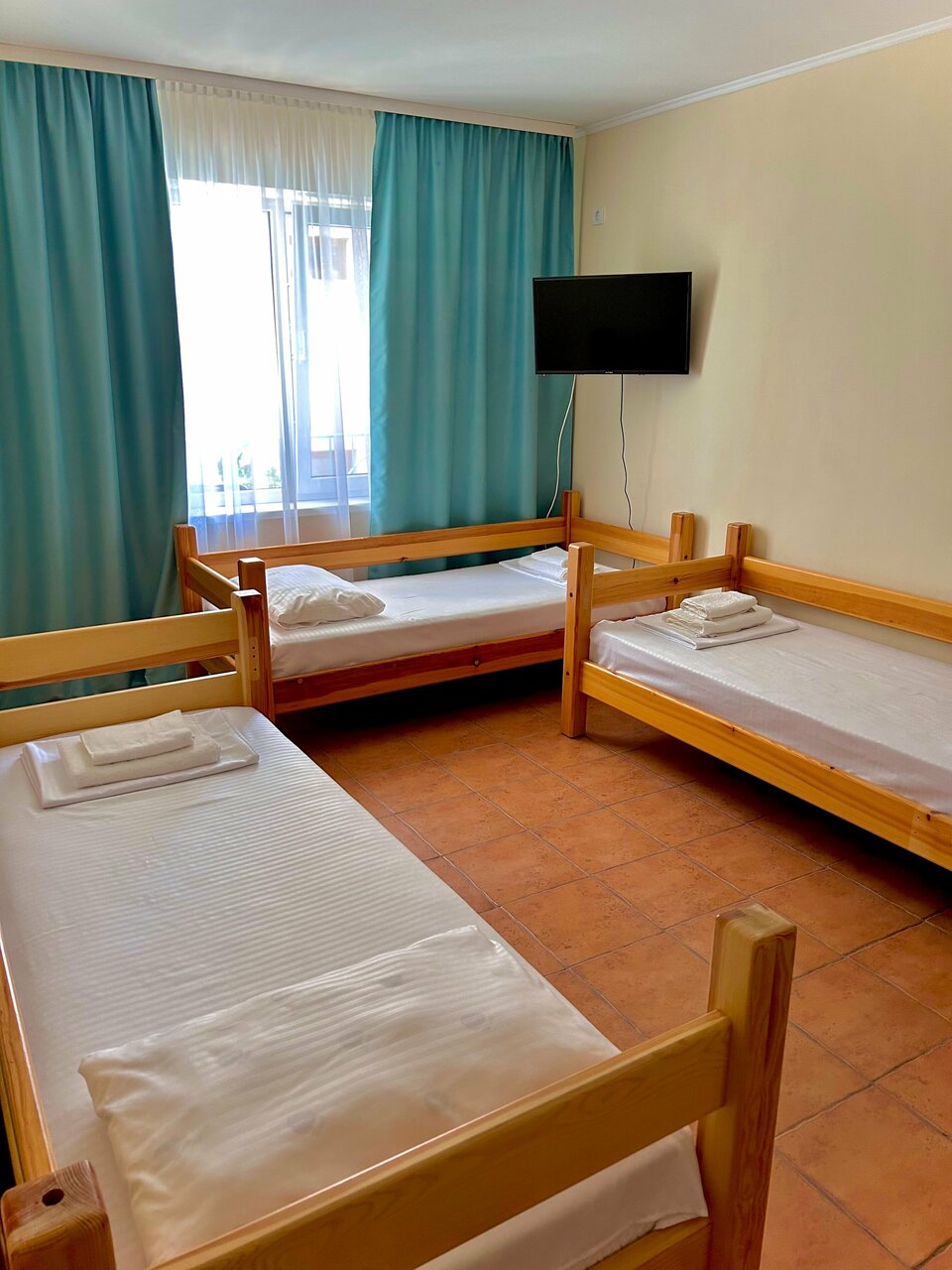 Удобства: — Кондиционер, Wi-Fi, телевизор, холодильник, фен, сейф. — Бесплатная парковка, общая кухня, терраса, сад, детская площадка. — Собственный галечный пляж (шезлонги, зонтики). — Питание: завтрак, полупансион или полный пансион (по выбору). — Трансфер (платный) до аэропорта, вокзалов и автовокзала. — Разрешено проживание с животными (за доплату).