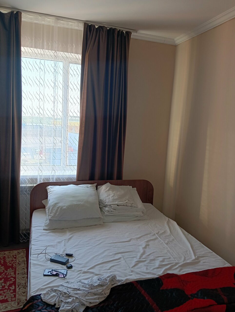 Гостиница Олимп — громко сказано… Худшая гостиница по дороге М-4. Заехали все уставшие, за номер 4 кровати — 5 тысяч. Номер ГРЯЗНЫЙ, обои оторваны, в туалете все грязь, полы, душевая, даже мыльница, туалетная бумага самая дешовая, кондиционер еле работает. В общем с дороги уснули, проснулись были в шоке от увиденного при дневном свете, поскорее захотелось от туда убежать. Объзжайте это место стороной, утром проехали подальше, по пути попалось очень много красивых гостиниц